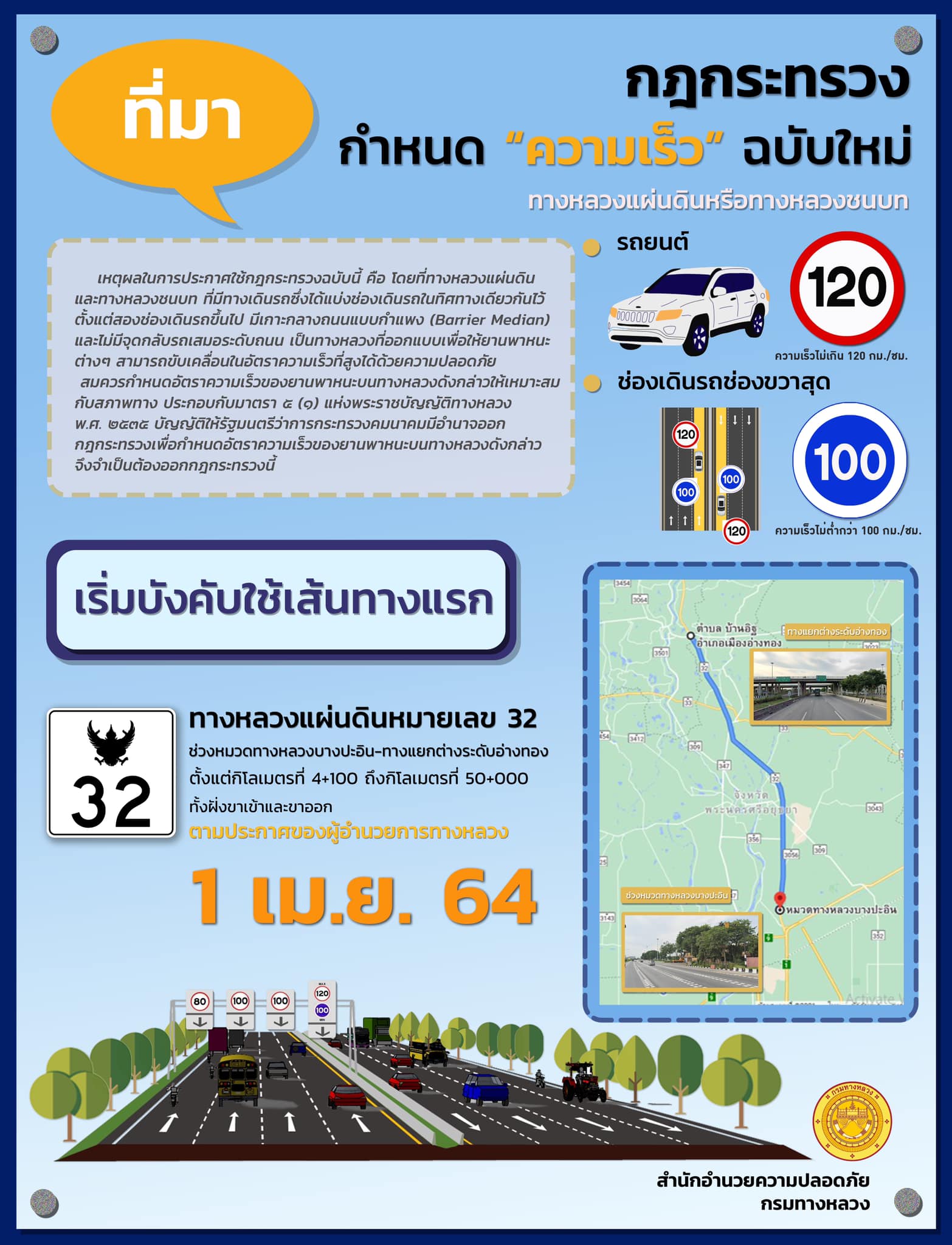 ศักดิ์สยามเดินหน้า Kick off อนุญาตให้รถวิ่งได้ 120 กม./ชม. เปิดเส้นทางต้นแบบ “ทางหลวงแผ่นดินหมายเลข 32 ช่วงบางปะอิน – ต่างระดับอ่างทอง”