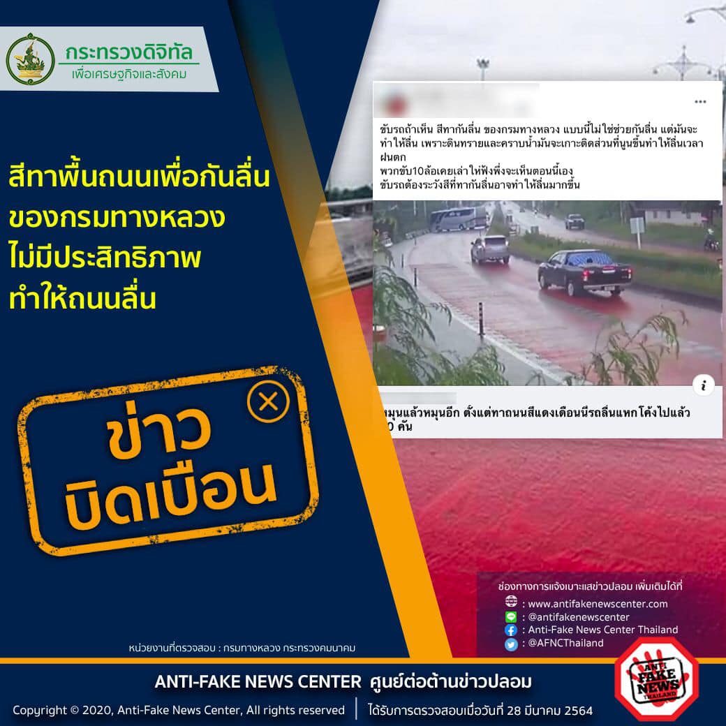 ข่าวบิดเบือน สีทาพื้นถนนเพื่อกันลื่น ของกรมทางหลวงไม่มีประสิทธิภาพทำให้ถนนลื่น