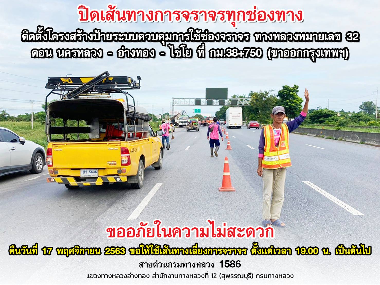 แจ้งปิดเส้นทางการจราจรทุกช่องทาง ทางหลวงหมายเลข 32 ที่ กม.38+750 (ขาออก กทม.)