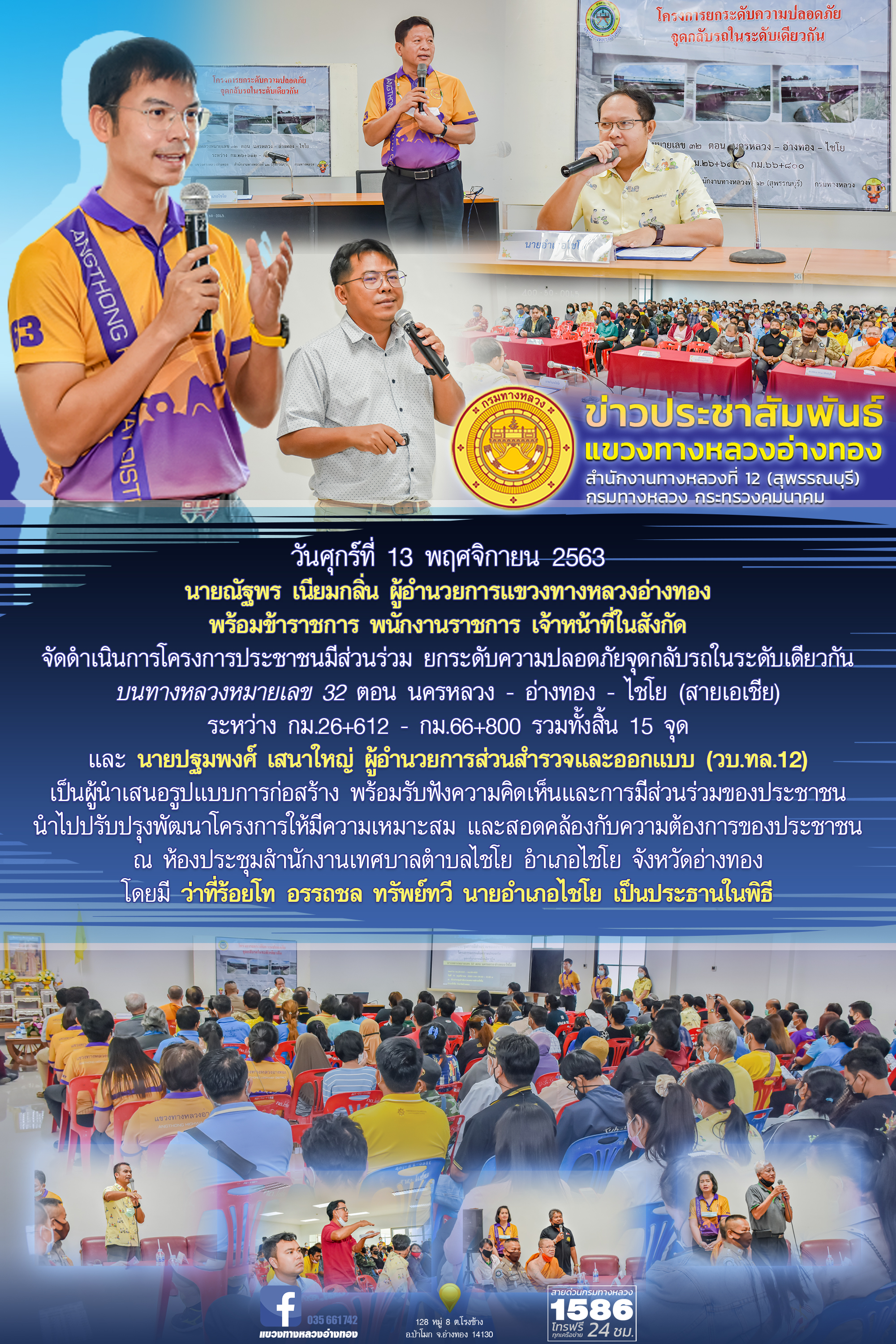 แขวงทางหลวงอ่างทอง เปิดศูนย์อำนวยความสะดวกและปลอดภัยช่วงเทศกาลปีใหม่ 2564