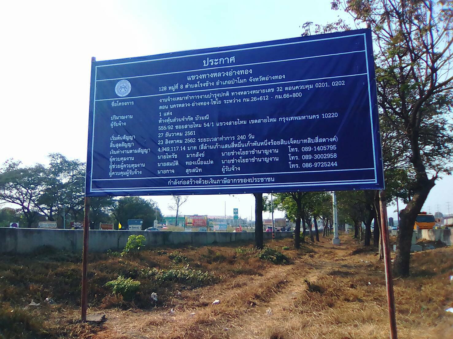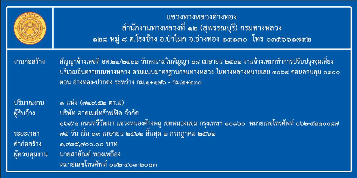 ดำเนินการจ้างเหมาทำการปรับปรุงจุดเสี่ยงและบริเวณอันตรายบนทางหลวง ตามแบบมาตรฐานกรมทางหลวง ในทางหลวงหมายเลข 3064 ตอน อ่างทอง – ปากดง ระหว่าง กม. 1+176 – กม.2+230 ตามสัญญาจ้างเลขที่ อท.22/2562 ลงวันที่ 18 เมษายน 2562