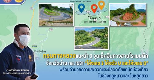กรมทางหลวง แนะนำ 3 จุดเช็คอินทางสายโรแมนติก ทางหลวงหมายเลข 1081 จังหวัดน่าน “โค้งเลข 3 โค้งตัว U และโค้งเลข 0” พร้อมอำนวยความสะดวกและปลอดภัยแก่นักท่องเที่ยวในช่วงฤดูหนาวและวันหยุดยาว