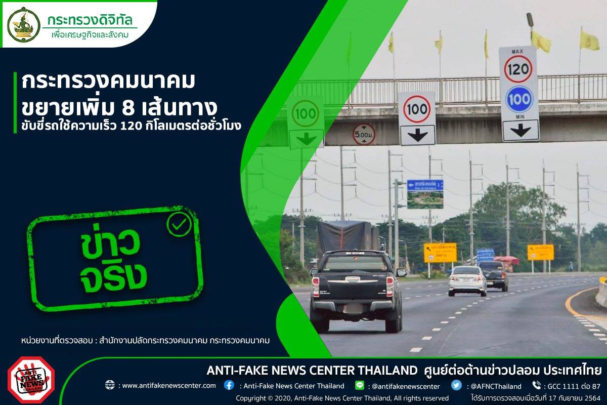 กระทรวงคมนาคม ชี้แจงข่าวการขยายเพิ่ม 8 เส้นทาง ขับขี่รถใช้ความเร็ว 120 กิโลเมตรต่อชั่วโมง เป็น "ข่าวจริง"