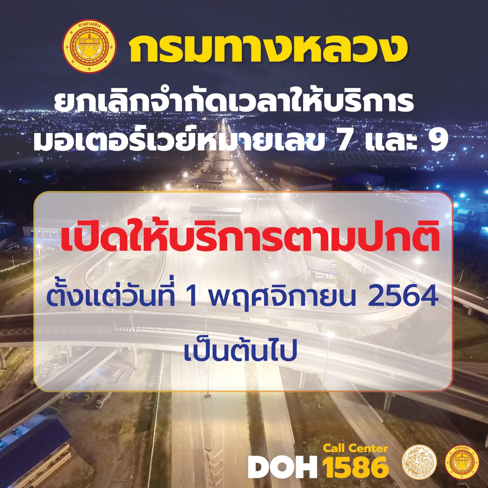 กรมทางหลวงยกเลิกจำกัดเวลาให้บริการมอเตอร์เวย์ หมายเลข 7 และ 9