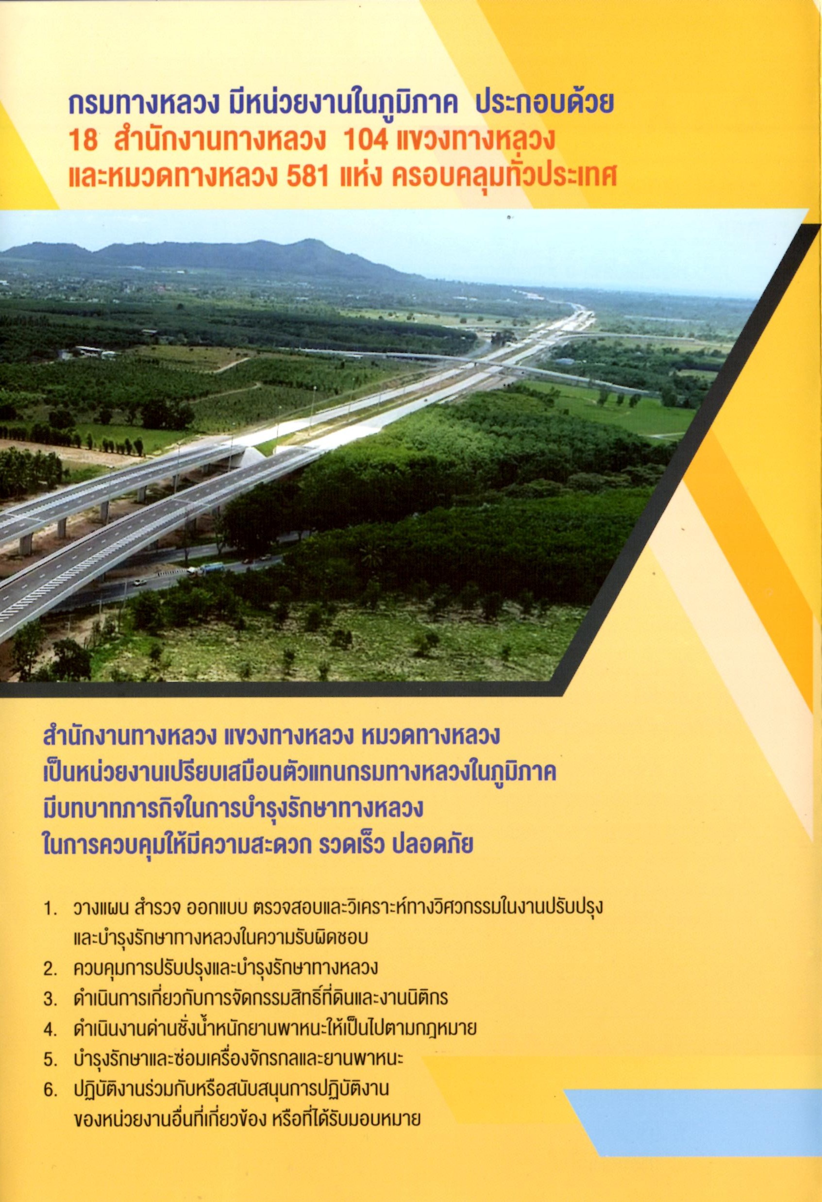 กรมทางหลวง เป็นหน่วยงานในสังกัดกระทรวงคมนาคมมีภารกิจตามอำนาจหน้าที่ในการพัฒนาโครงสร้างพื้นฐานด้านทางหลวงให้มีโครงข่ายสมบูรณ์ครอบคลุมทั่วประเทศและเชื่อมโยง กับต่างประเทศ สนองนโยบายและแผนพัฒนาทางหลวงควบคุมและดำเนินการก่อสร้างบูรณะและบำรุงรักษาทางหลวงพิเศษ ทางหลวงแผ่นดิน และทางหลวงสัปทาน ศึกษา วิเคราะห์ วิจัยและพัฒนา จัดทำมาตรฐานและข้อกำหนดเกี่ยวกับงานทางพัฒนาบุคลากรและเทคโนโลยีที่เกี่ยวข้องในระดับสากลตลอดจนกำกับตรวจตรา ควบคุมทางหลวงและงานทางในความรับผิดชอบ ให้เป็นไปตามกฎหมายที่เกี่ยงข้อง เพื่ออำนวยความสะดวกรวดเร็วและปลอดภัยในทางหลวงทั่วประเทศ เอื้อประโยชน์ในการพัฒนาเศรษฐกิจ สังคมการปกครอง ความมั่นคง และการป้องกันประเทศ นอกจากนี้ ยังมีหน้าที่ในการบำรุงรักษาทางหลวงทั่วประเทศกว่า 60,000 กิโลเมตร