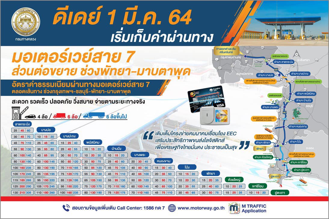 ทั้งนี้ ตั้งแต่เวลา 00.01 น. ของวันที่ 1 มี.ค. 64 เป็นต้นไป เฉพาะผู้ใช้เส้นทางมอเตอร์เวย์หมายเลข 7 ที่เดินทางผ่านส่วนต่อขยายช่วงพัทยา – มาบตาพุด จะต้องจ่ายค่าธรรมเนียมผ่านทางเพิ่มขึ้น เช่น ค่าธรรมเนียมผ่านทางสำหรับรถยนต์ 4 ล้อ จากกรุงเทพฯ ถึง มาบตาพุด (ด่านฯ อู่ตะเภา) จากเดิม 105 บาท เป็น 130 บาท หรือ จากพัทยา ถึง มาบตาพุด (ด่านฯ อู่ตะเภา) จากเดิมวิ่งฟรี จะต้องจ่ายค่าธรรมเนียมผ่านทาง 30 บาท เป็นต้น สำหรับอัตราค่าธรรมเนียมผ่านทางตลอดเส้นทาง บนทางหลวงพิเศษระหว่างเมืองหมายเลข 7 สายกรุงเทพฯ - บ้านฉาง ช่วงกรุงเทพฯ - ชลบุรี - พัทยา - มาบตาพุด ตั้งแต่วันที่ 1 มี.ค. 64 เป็นต้นไป แยกตามประเภทยานพาหนะได้ดังนี้ รถยนต์ 4 ล้อ 10-130 บาท, รถยนต์ 6 ล้อ 15-210 บาท และรถยนต์มากกว่า 6 ล้อขึ้นไป 20-305 บาท โดยผู้ที่เดินทางสามารถเข้าออกได้ทุกด่าน อย่างสะดวก รวดเร็ว ตลอด 24 ชั่วโมง
