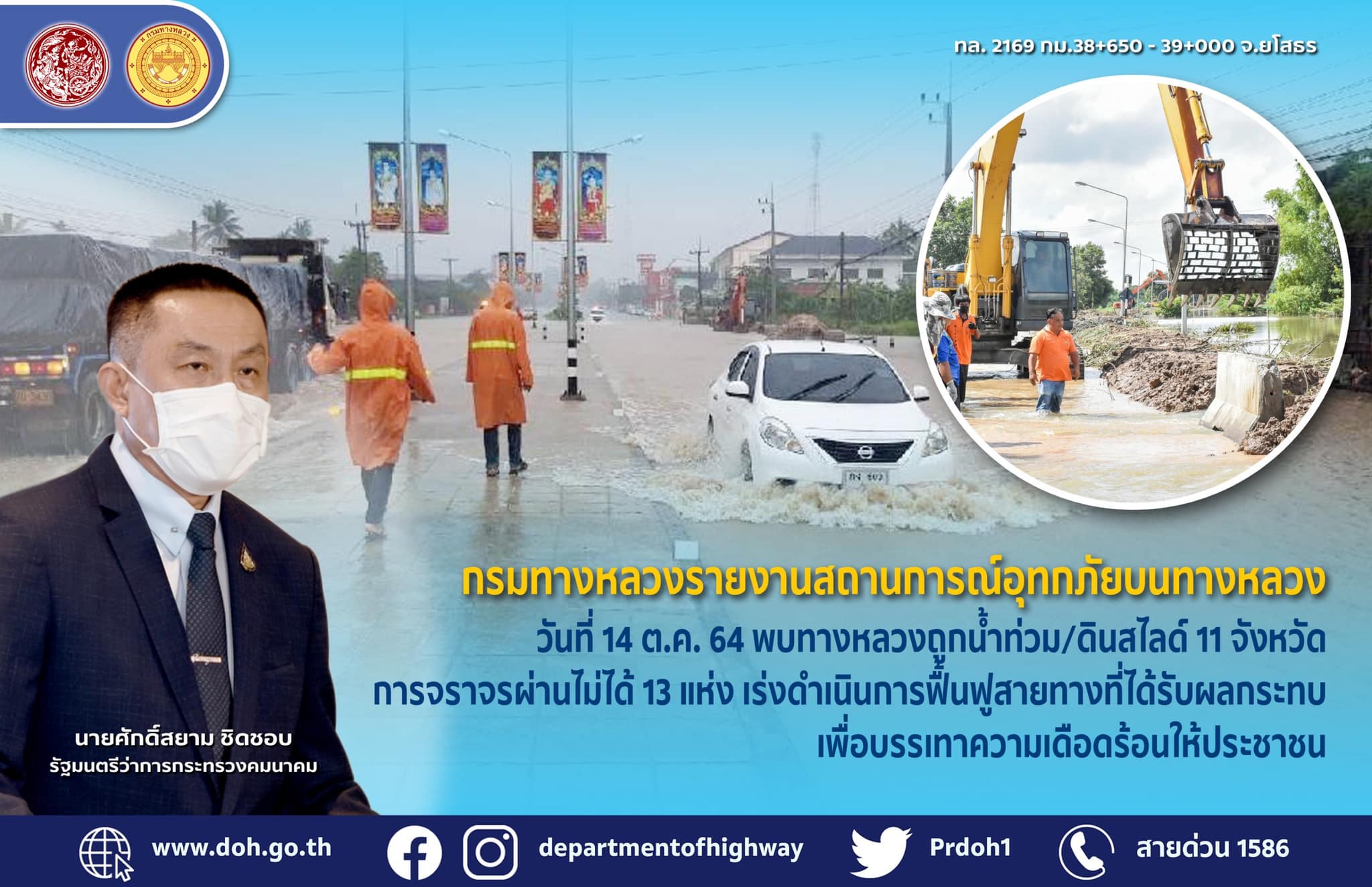 สำหรับสถานการณ์ประจำวันที่ 14 ตุลาคม 2564 เวลา 13.30 น. พบทางหลวงถูกน้ำท่วม/ดินสไลด์ และสะพานชำรุด จำนวน 11 จังหวัด ( 26 สายทาง 46 แห่ง) โดยทางหลวงในจังหวัดที่ได้รับผลกระทบจากอุทกภัย ได้แก่ 1) จ.ขอนแก่น 2) จ.มหาสารคาม 3) จ.มุกดาหาร 4) จ.นนทบุรี 5) จ.อ่างทอง 6) จ.พระนครศรีอยุธยา 7) จ.สุพรรณบุรี 8) จ.นครสวรรค์ 9) จ.จันทบุรี 10) จ.ปราจีนบุรี 11) จ.สระแก้ว ซึ่งมีการจราจรผ่านไม่ได้ 13 แห่ง ดังนี้