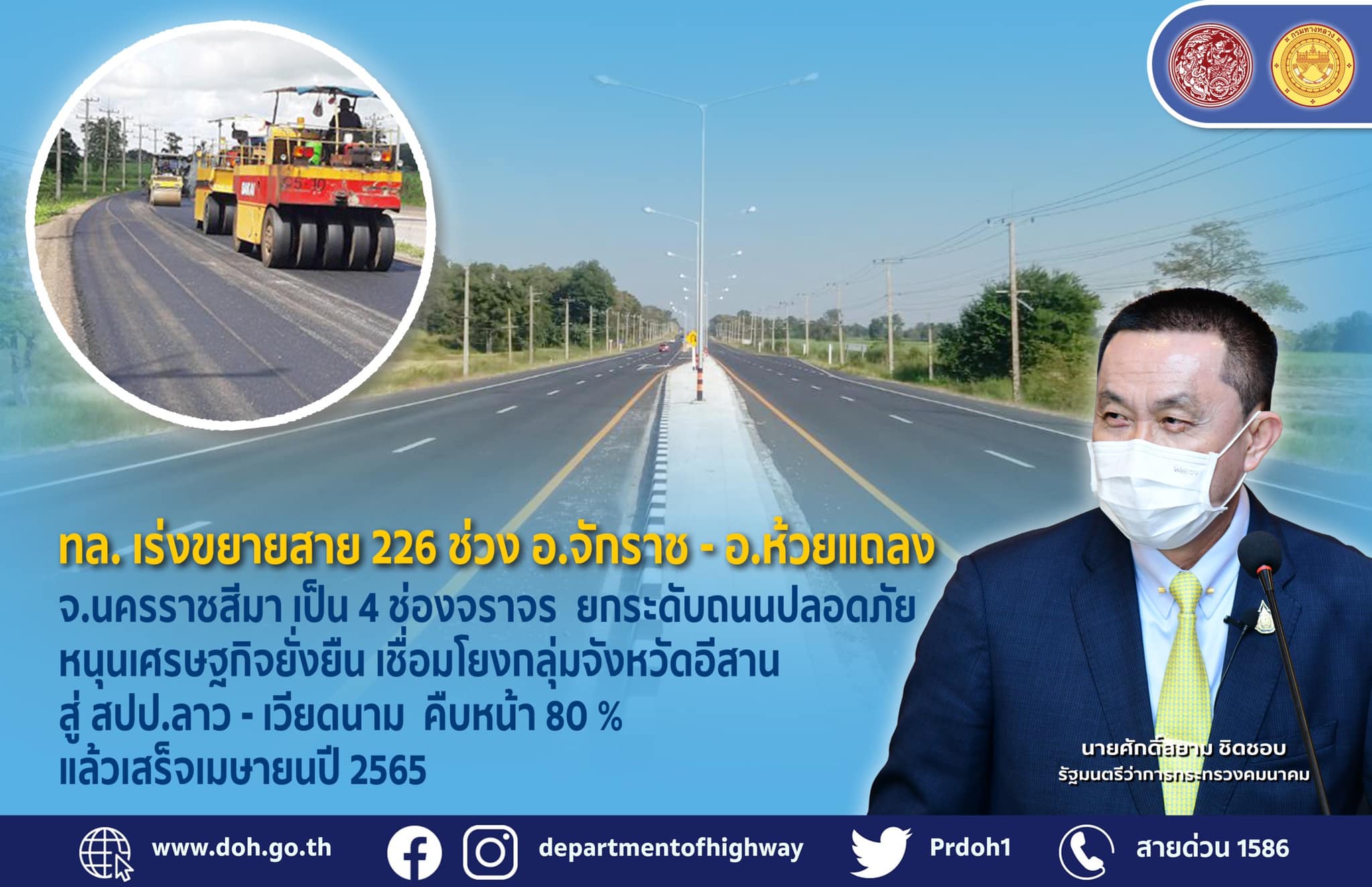 นายสราวุธ ทรงศิวิไล อธิบดีกรมทางหลวง เปิดเผยว่า ตามที่นายศักดิ์สยาม ชิดชอบ รัฐมนตรีว่าการกระทรวงคมนาคม ได้มอบให้กรมทางหลวงขับเคลื่อนพัฒนาโครงข่ายทางหลวงเพื่อสนับสนุนยุทธศาสตร์การพัฒนาทางหลวงเพื่อพัฒนาเศรษฐกิจในภาคตะวันออกเฉียงเหนือ พร้อมให้เร่งดำเนินโครงการก่อสร้างขยายทางหลวงหมายเลข 226 สาย อ.เฉลิมพระเกียรติ - อ.จักราช - อ.ห้วยแถลง ในพื้นที่จังหวัดนครราชสีมาเป็น 4 ช่องจราจร ยกระดับความปลอดภัย ช่วยแก้ไขปัญหาการจราจร รองรับเชื่อมโยงการเดินทางกลุ่มจังหวัดภาคตะวันออกเฉียงเหนือไปยังสาธารณรัฐประชาธิปไตยประชาชนลาวและประเทศเวียดนาม สนับสนุนการค้าการท่องเที่ยวสู่การพัฒนาเศรษฐกิจอย่างยั่งยืนตามนโยบายของรัฐบาล
