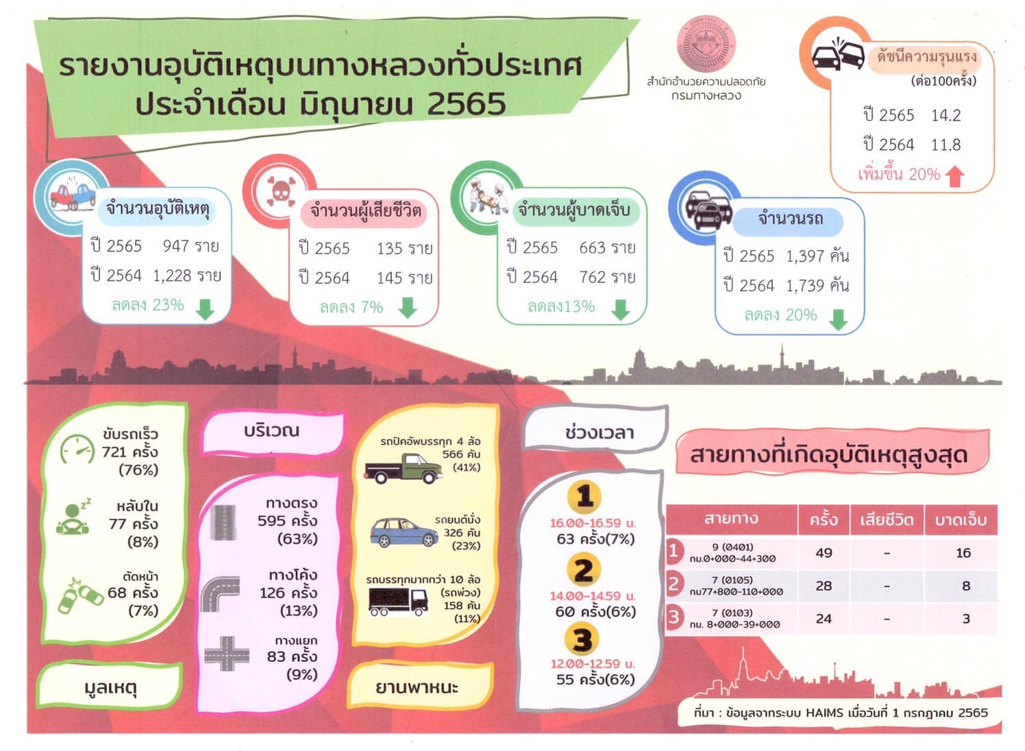 กรมทางหลวง โดยสำนักอำนวยความปลอดภัย ได้สรุปรายงานข้อมูลอุบัติเหตุบนทางหลวงทั่วประเทศประจำ เดือนมิถุนายน 2565 จากการรายงานอุบัติเหตุทางระบบ HAIMS พบว่า อุบัติเหตุเกิดขึ้นบนทางหลวงในความรับผิดชอบของกรมทางหลวง จำนวน 947 ครั้ง ทำให้มีผู้เสียชีวิต 135 คน ได้รับบาดเจ็บทั้งสิ้น 663 คน จำนวน รถที่เกิดอุบัติเหตุ 1,397 คัน เป็นเหตุให้ทรัพย์สินของกรมทางหลวงเสียหายประมาณ 12 ล้านบาท เมื่อเปรียบเทียบสถิติอุบัติเหตุประจำเดือนมิถุนายน 2564 จำนวนอุบัติเหตุลดลงจากปีที่ผ่านมา 23% ผู้เสียชีวิตลดลง 7% บาดเจ็บลดลง 13% จำนวนรถที่เกิดอุบัติเหตุลดลง 20% ซึ่งสาเหตุหลักการเกิดอุบัติเหตุมาจากผู้ขับขี่ขับรถด้วยความเร็วสูงกว่ากฎหมายกำหนด 76% (721 ครั้ง) รองลงมาได้แก่ หลับใน 8% (77 ครั้ง) การตัดหน้าระยะกระชั้นชิด 7% (68 ครั้ง) และอุปกรณ์รถบกพร่อง 4% (41 ครั้ง)