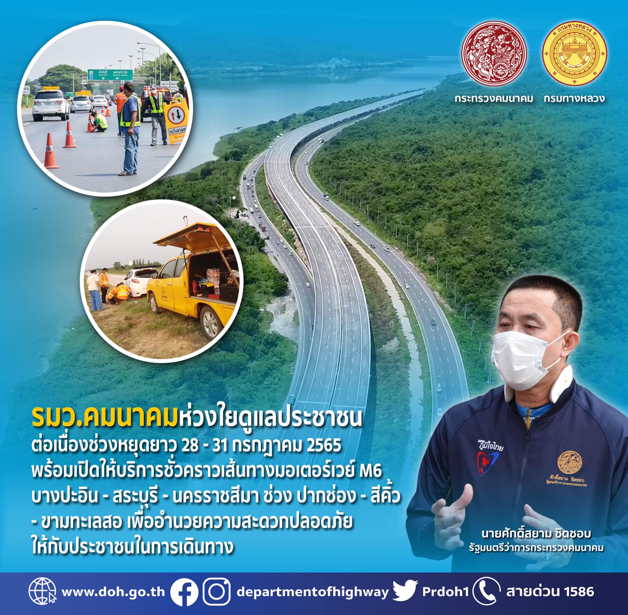 รมว.คมนาคมห่วงใยดูแลประชาชนต่อเนื่องช่วงหยุดยาว 28 -31 กรกฎาคม 2565 พร้อมเปิดให้บริการชั่วคราวเส้นทางมอเตอร์เวย์ M6 บางปะอิน-สระบุรี-นครราชสีมา ช่วง ปากช่อง - สีคิ้ว – ขามทะเลสอ เพื่ออำนวยความสะดวกปลอดภัยให้กับประชาชนในการเดินทาง