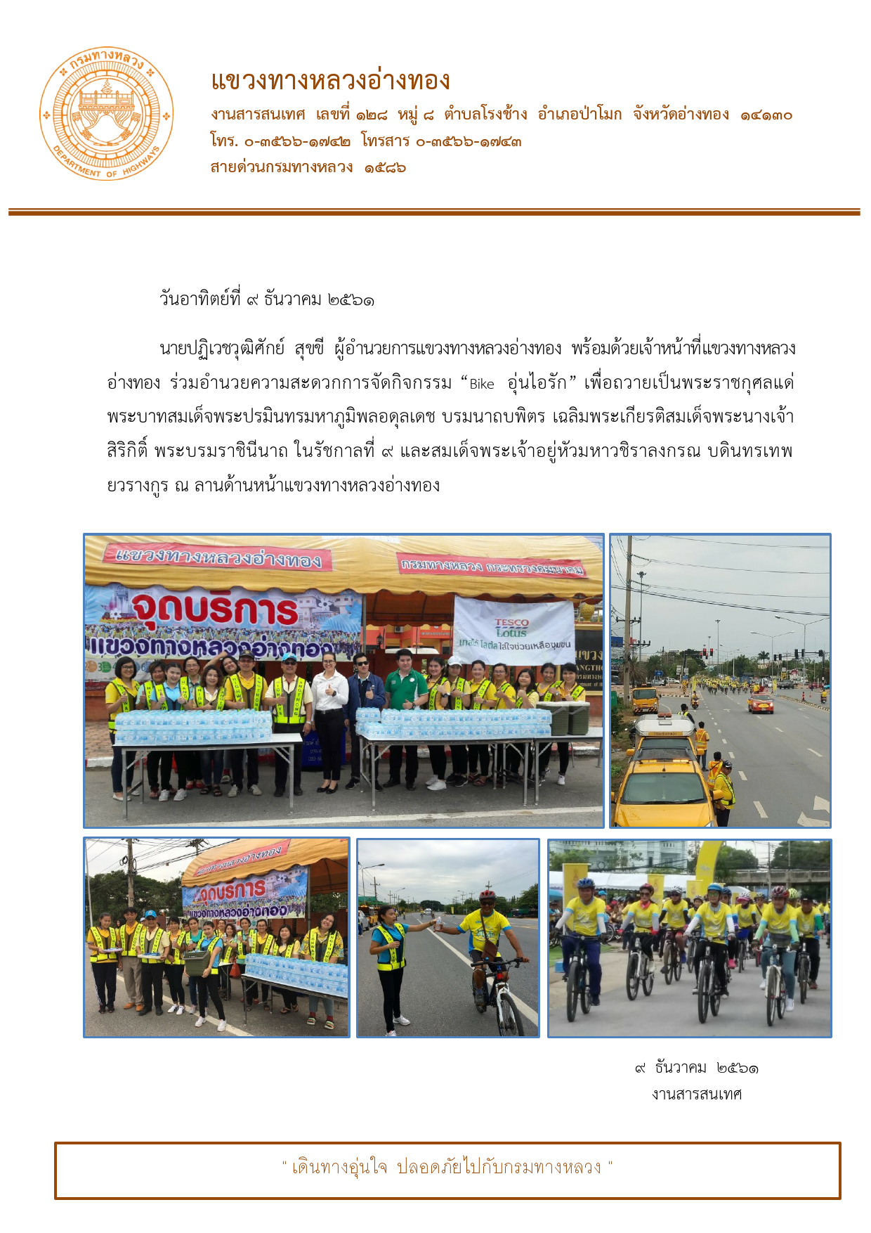 นายปฏิเวชวุฒิศักย์ สุขขี ผู้อำนวยการแขวงทางหลวงอ่างทอง พร้อมด้วยเจ้าหน้าที่แขวงทางหลวงอ่างทอง ร่วมอำนวยความสะดวกการจัดกิจกรรม “Bike อุ่นไอรัก” เพื่อถวายเป็นพระราชกุศลแด่พระบาทสมเด็จพระปรมินทรมหาภูมิพลอดุลเดช บรมนาถบพิตร เฉลิมพระเกียรติสมเด็จพระนางเจ้าสิริกิติ์ พระบรมราชินีนาถ ในรัชกาลที่ 9 และสมเด็จพระเจ้าอยู่หัวมหาวชิราลงกรณ บดินทรเทพยวรางกูร ณ ลานด้านหน้าแขวงทางหลวงอ่างทอง