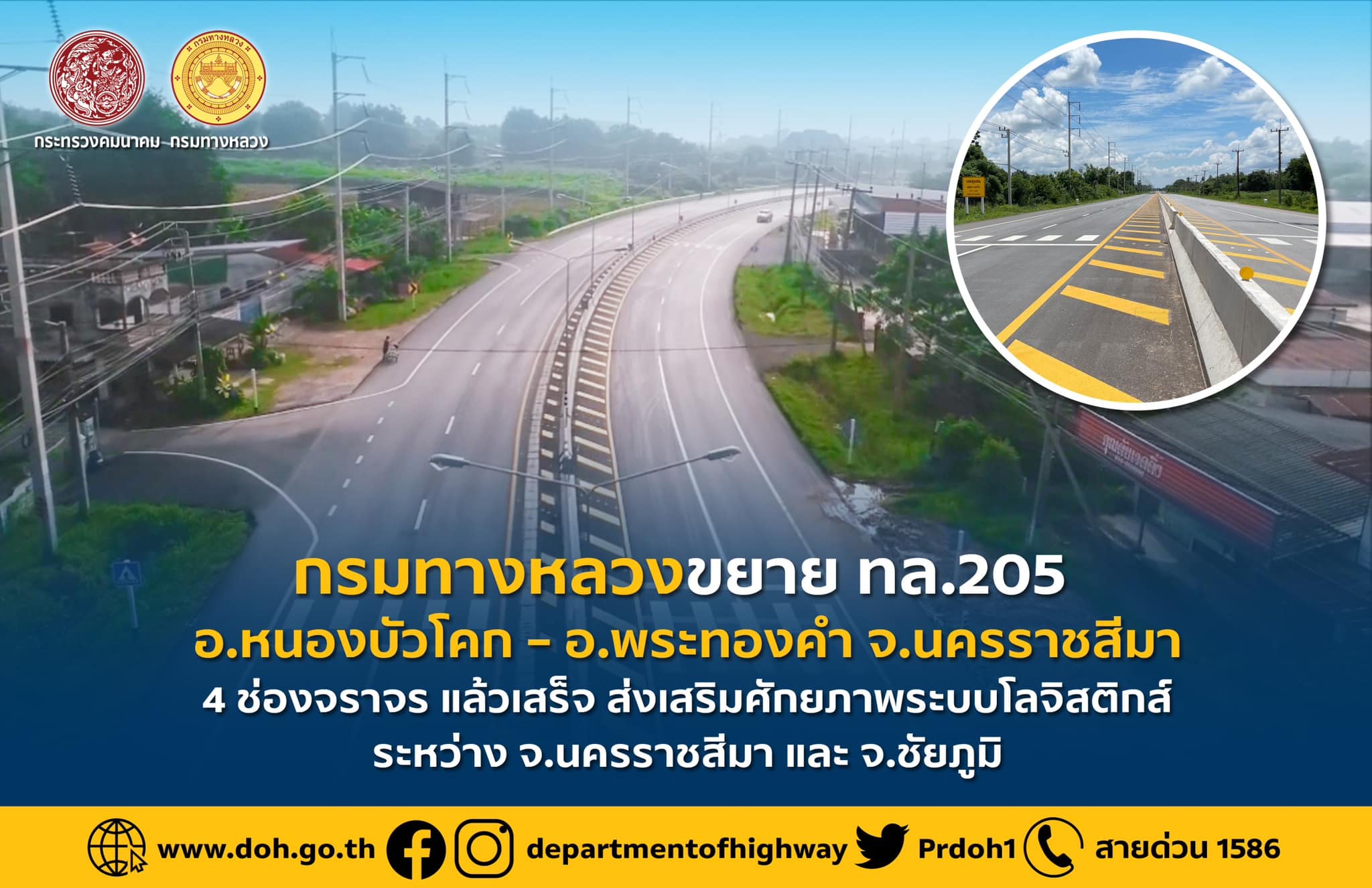กรมทางหลวงขยาย ทล.205 อ.หนองบัวโคก – อ.พระทองคำ จ.นครราชสีมา 4 ช่องจราจร แล้วเสร็จ ส่งเสริมศักยภาพระบบโลจิสติกส์ระหว่าง จ.นครราชสีมา และ จ.ชัยภูมิ