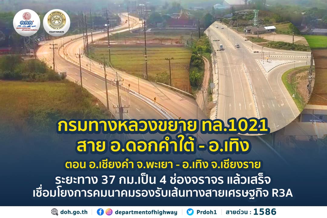 กรมทางหลวง โดยสำนักก่อสร้างทางที่ 1 ดำเนินการก่อสร้างทางหลวงหมายเลข 1021 สาย อ.ดอกคำใต้ – อ.เทิง ตอน อ.เชียงคำ จ.พะเยา – อ.เทิง จ.เชียงราย ระหว่าง กม.59+200 – กม.100+019 ระยะทางรวม 37 กิโลเมตร เป็น 4 ช่องจราจรแล้วเสร็จ เพื่ออำนวยความสะดวกแก่ประชาชนผู้ใช้เส้นทาง รองรับการคมนาคมโลจิสติกส์พื้นที่ชายแดนไทย – สาธารณรัฐประชาธิปไตยประชาชนลาว – สาธารณรัฐประชาชนจีน รวมถึงประชาคมเศรษฐกิจอาเซียน