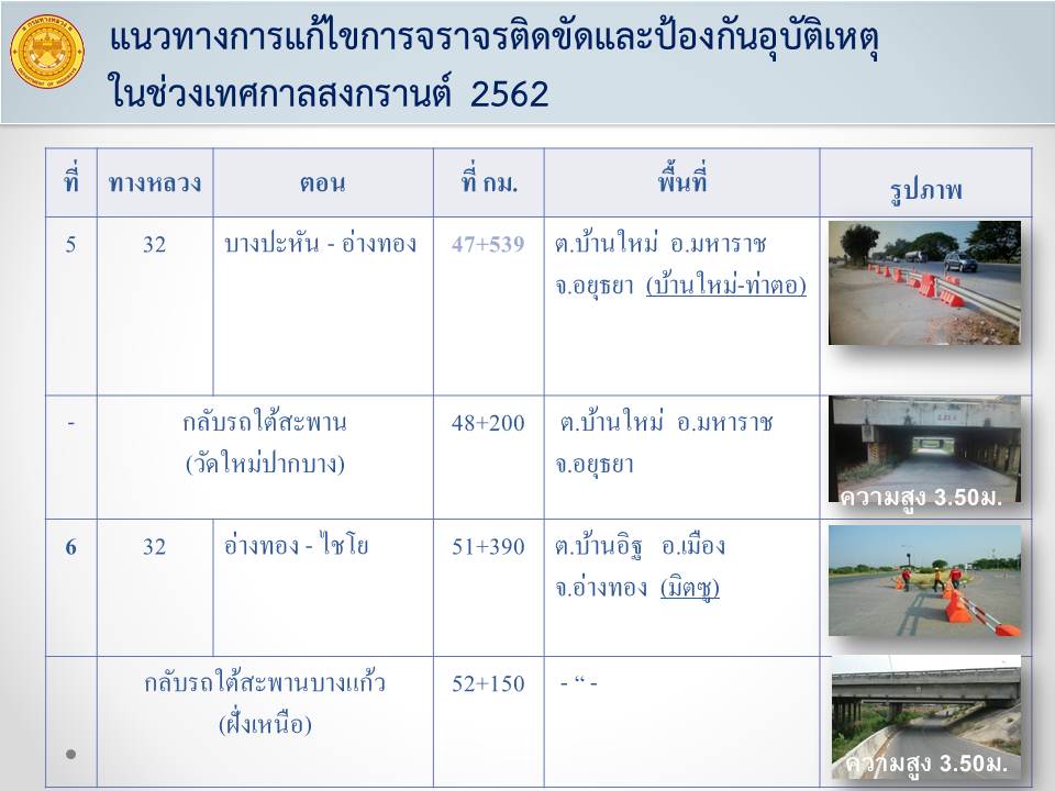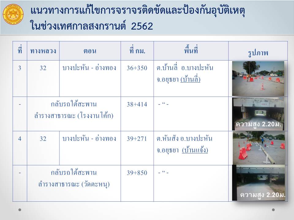 ด้วยเทศกาลสงกรานต์ 2562 จะมีประชาชนสัญจรในเส้นทางสายหลักจำนวนมาก เพื่อให้เกิดความปลอดภัยในการเดินทาง และลดจุดเสี่ยงที่จะทำให้เกิดอุบัติเหตุทางถนนสายหลัก แขวงทางหลวงอ่างทองจึงได้ทำการปิดจุดกลับรถบนทางหลวงหมายเลข 32 ตอน นครหลวง - อ่างทอง –ไชโย จำนวน 15 แห่ง เป็นการชั่วคราว