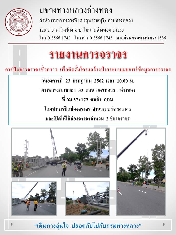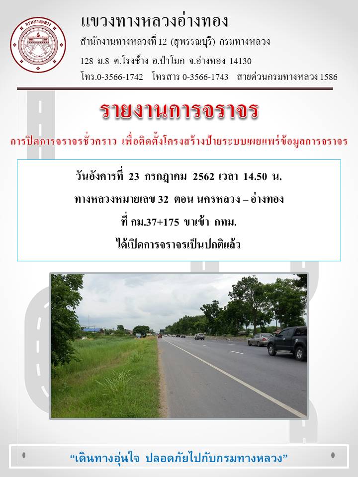 แขวงทางหลวงอ่างทอง ดำเนินการเปิดการจราจรบนทางหลวงหมายเลข 32 ตอน นครหลวง – อ่างทอง ที่ กม.37+175 (ขาเข้า) ใช้งานตามปกติเมื่อเวลา 14.30 น. ทั้งนี้ต้องขออภัยในความไม่สะดวกมา ณ โอกาสนี้