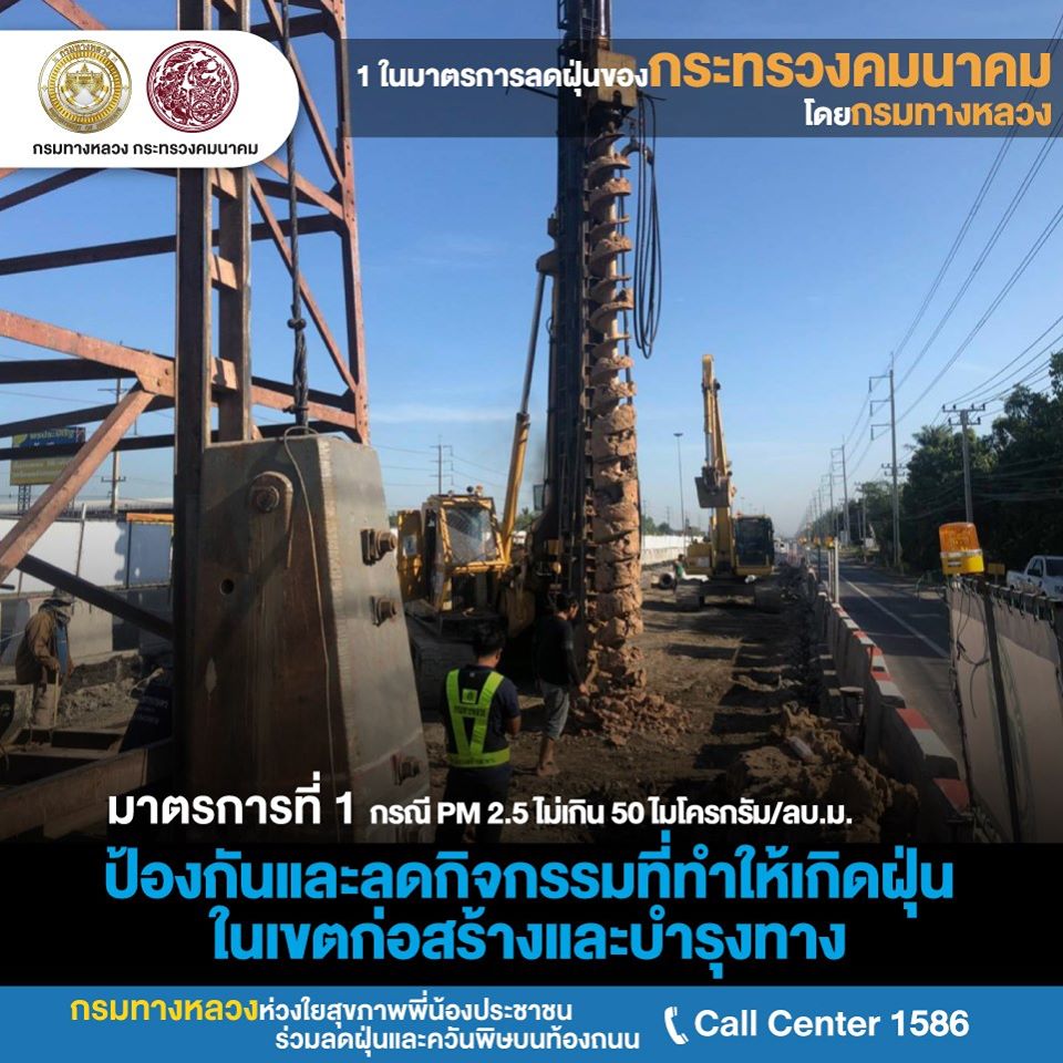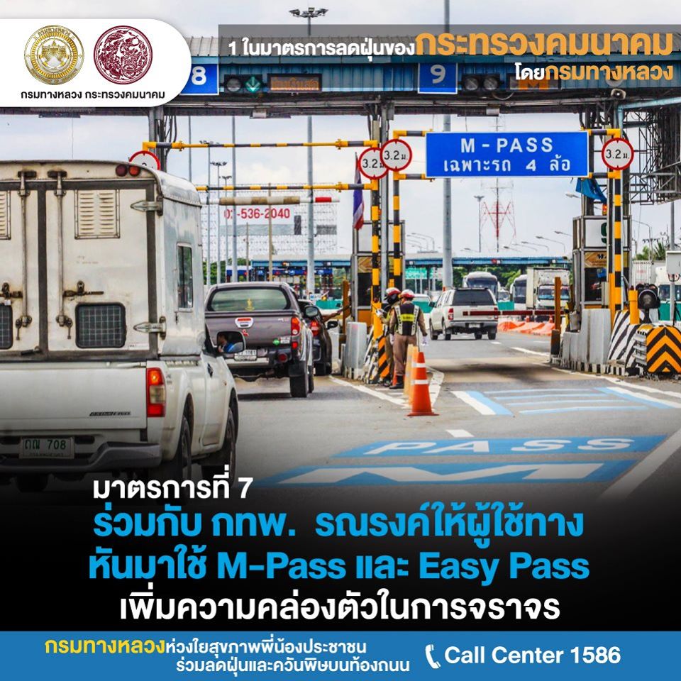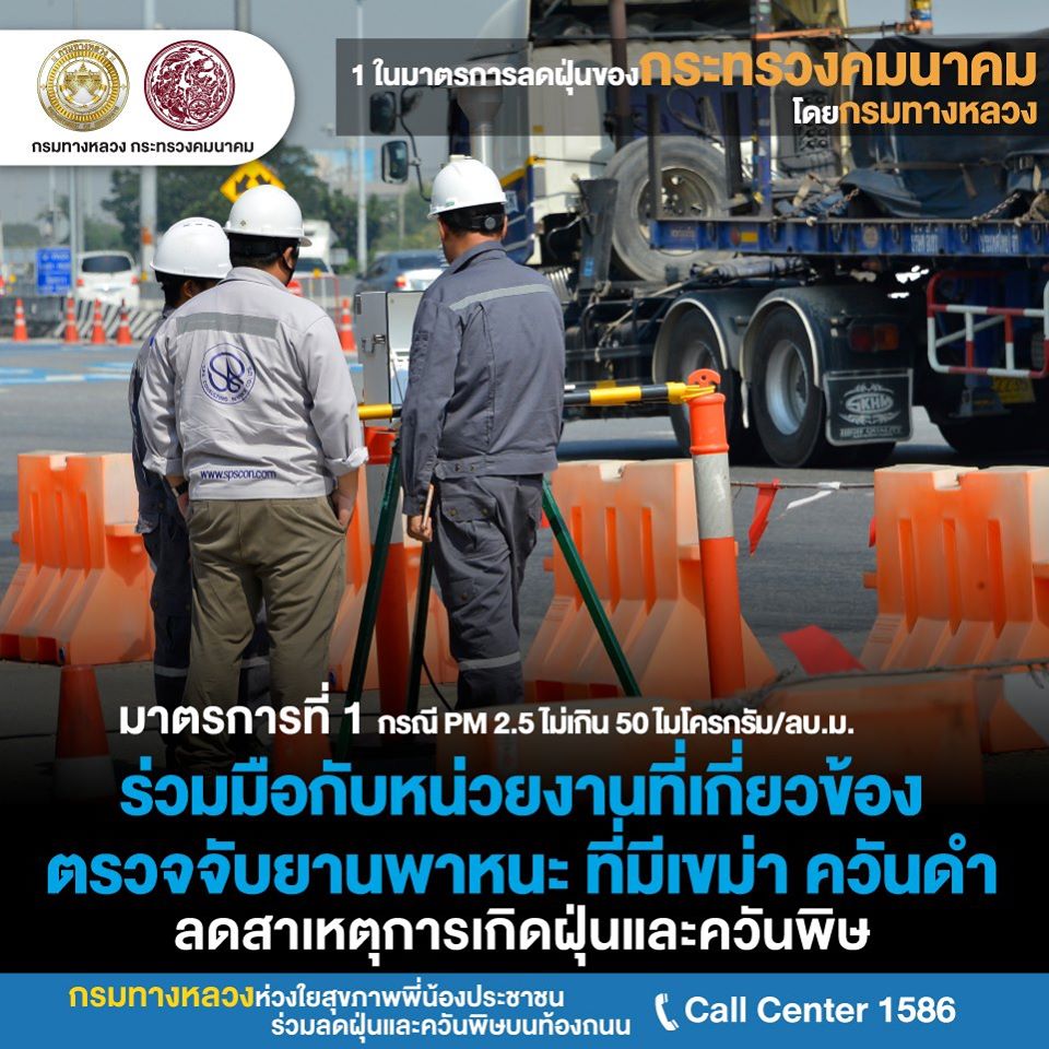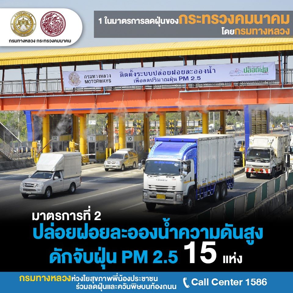 กรมทางหลวงเปิด 8 ปฏิบัติการต่อเนื่อง ลุยแก้ไขปัญหามลพิษ PM 2.5เปิด 8 ปฏิบัติการกรมทางหลวง ลุยแก้ปัญหาฝุ่น PM 2.5 อย่างต่อเนื่อง หวังลดผลกระทบประชาชน โดยการเข้มงวดงานก่อสร้าง-บำรุงทางให้ก่อฝุ่นน้อยที่สุด ติดตั้งเครื่องปล่อยละอองน้ำจับฝุ่น 15 แห่ง ร่วมมือหลายหน่วยงานเข้มใช้รถควันดำ จอดแช่ ลดค่าธรรมเนียมผ่านทาง M-Pass และEasy Pass จูงใจใช้เพิ่ม ลดปัญหารถติดหน้าด่านก่อมลพิษ