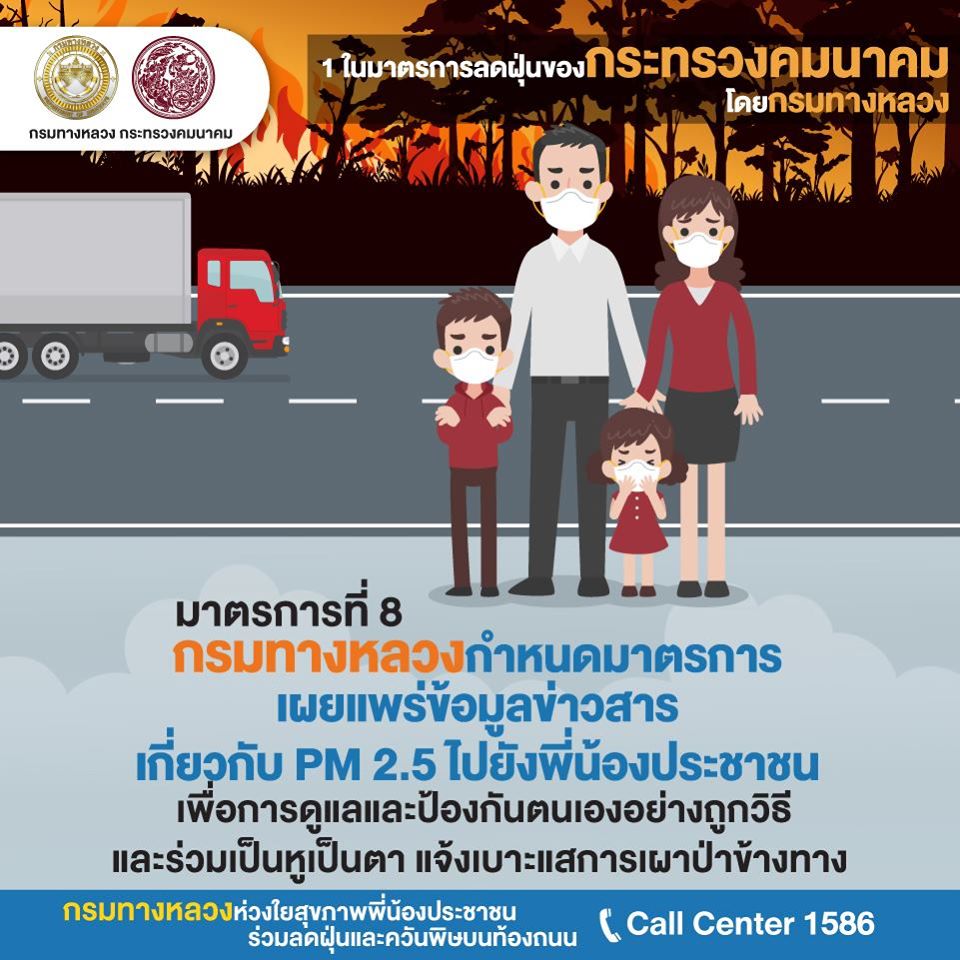 มาตรการที่แปด การเผยแพร่ข้อมูลข่าวสารเกี่ยวกับ PM 2.5 ไปยังประชาชน เพื่อให้ความรู้เกี่ยวกับการดูแลและป้องกันตนเองอย่างถูกวิธี และร่วมเป็นส่วนหนึ่งในการช่วยดูแลปัญหาการเกิดไฟไหม้ข้างทาง โดยสามารถแจ้งเบาะแสได้ที่สายด่วนกรมทางหลวง 1586 (โทรฟรีทุกเครือข่ายตลอด 24 ชั่วโมง)“กรมทางหลวงเป็นห่วงสุขภาพของผู้ใช้ทางและประชาชน จึงเร่งดำเนินการแก้ไขปัญหาฝุ่น PM 2.5 อย่างต่อเนื่อง และยังกำชับการเดินทางของบุคลากรของกรมทางหลวง โดยเปลี่ยนมาใช้ระบบขนส่งสาธารณะโดยเฉพาะรถไฟฟ้าเพื่อลดการใช้รถยนต์ส่วนตัว ตลอดจนให้ใช้รถยนต์ร่วมกันในการเดินทางเส้นทางเดียวกัน รวมทั้งห้ามกำจัดขยะโดยการเผาอย่างเด็ดขาด และรณรงค์ให้มีการประหยัดพลังงาน ในสำนักงาน” นายสราวุธ กล่าว