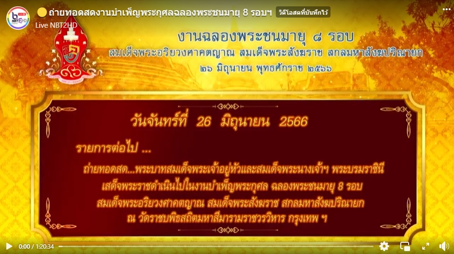 ถ่ายทอดสด พระบาทสมเด็จพระเจ้าอยู่หัว และสมเด็จพระนางเจ้าฯ พระบรมราชินี เสด็จพระราชดำเนินไปในงานบำเพ็ญพระกุศล ฉลองพระชนมายุ ๘ รอบ สมเด็จพระอริยวงศาคตญาณ สมเด็จพระสังฆราช สกลมหาสังฆปรินายก