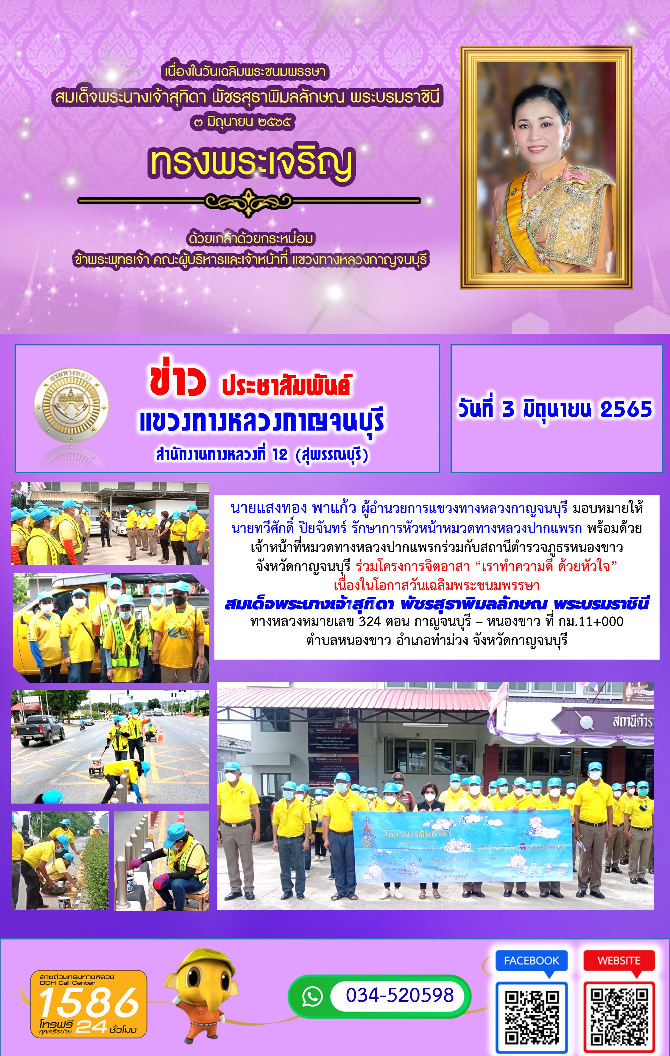วันที่ 3 มิถุนายน 2565 นายแสงทอง พาแก้ว ผู้อำนวยการแขวงทางหลวงกาญจนบุรี มอบหมายให้ นายทวีศักดิ์ ปิยจันทร์ รักษาการหัวหน้าหมวดทางหลวงปากแพรก พร้อมด้วยเจ้าหน้าที่หมวดทางหลวงปากแพรก ร่วมกับสถานีตำรวจภูธรหนองขาว จังหวัดกาญจนบุรี ร่วมโครงการจิตอาสา “เราทำความดี ด้วยหัวใจ” เนื่องในโอกาสวันเฉลิมพระชนมพรรษา สมเด็จพระนางเจ้าสุทิดา พัชรสุธาพิมลลักษณ พระบรมราชินี ทางหลวงหมายเลข 324 ตอน กาญจนบุรี – หนองขาว ที่ กม.11+000 ตำบลหนองขาว อำเภอท่าม่วง จังหวัดกาญจนบุรี