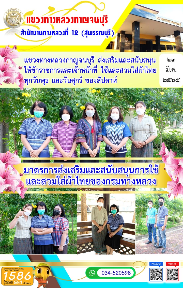 วันที่ 23 มี.ค. 2565 แขวงทางหลวงกาญจนบุรี รณรงค์แต่งกายด้วยผ้าไทย เพื่อส่งเสริมและสนับสนุนการใช้และสวมใส่ผ้าไทย เป็นการอนุรักษ์ และสืบสานภูมิปัญญาของไทย สร้างค่านิยมและการตระหนักรับรู้การรักษามรดก และอัตลักษณ์ภูมิปัญญาของไทย