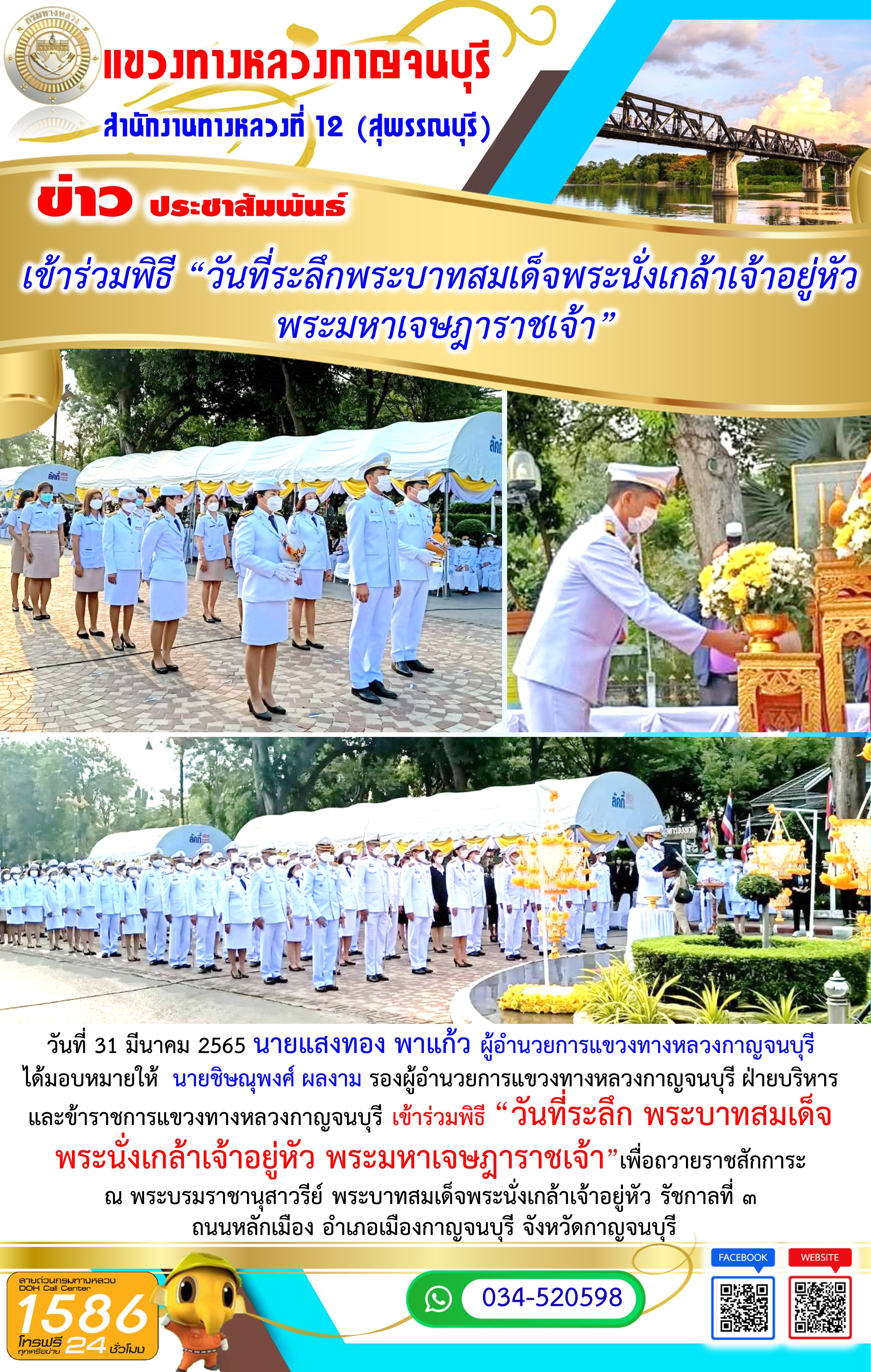 วันที่ 31 มีนาคม 2565 นายแสงทอง พาแก้ว ผู้อำนวยการแขวงทางหลวงกาญจนบุรี ได้มอบหมายให้ นายชิษณุพงศ์ ผลงาม รองผู้อำนวยการแขวงทางหลวงกาญจนบุรี ฝ่ายบริหาร และข้าราชการแขวงทางหลวงกาญจนบุรี เข้าร่วมพิธี “วันที่ระลึก พระบาทสมเด็จพระนั่งเกล้าเจ้าอยู่หัว พระมหาเจษฎาราชเจ้า”เพื่อถวายราชสักการะ ณ พระบรมราชานุสาวรีย์ พระบาทสมเด็จพระนั่งเกล้าเจ้าอยู่หัว รัชกาลที่ ๓ ถนนหลักเมือง อำเภอเมืองกาญจนบุรี จังหวัดกาญจนบุรี
