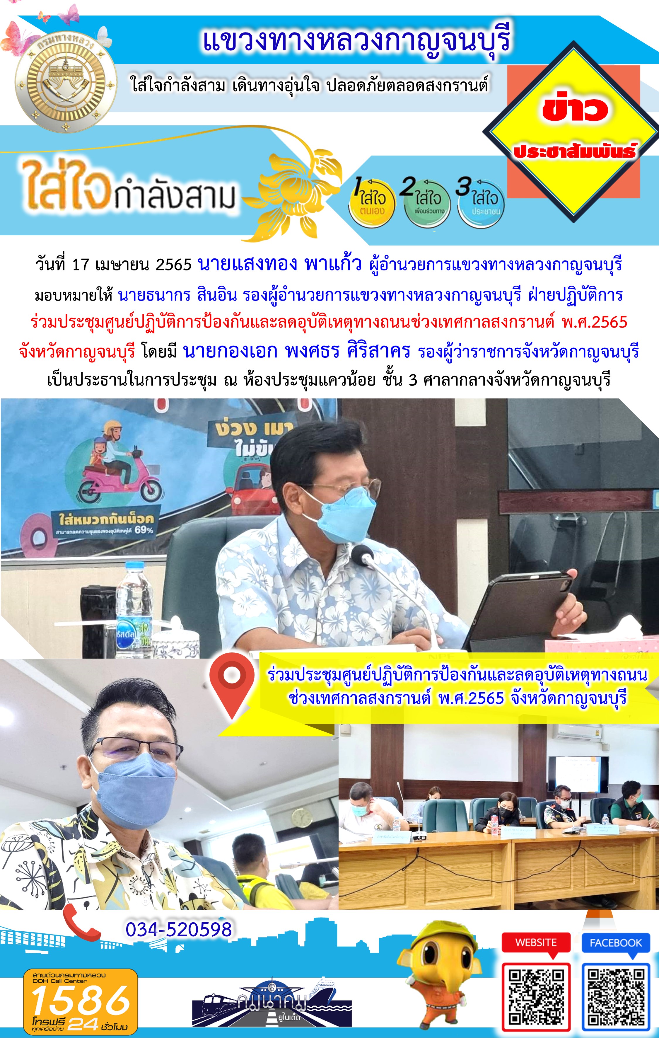 วันที่ 17 เมษายน 2565 นายแสงทอง พาแก้ว ผู้อำนวยการแขวงทางหลวงกาญจนบุรี มอบหมายให้ นายธนากร สินอิน รองผู้อำนวยการแขวงทางหลวงกาญจนบุรี ฝ่ายปฏิบัติการ ร่วมประชุมศูนย์ปฏิบัติการป้องกัน และลดอุบัติเหตุทางถนนช่วงเทศกาลสงกรานต์ พ.ศ.2565 จังหวัดกาญจนบุรี โดยมี นายกองเอก พงศธร ศิริสาคร รองผู้ว่าราชการจังหวัดกาญจนบุรี เป็นประธานในการประชุม ณ ห้องประชุมแควน้อย ชั้น 3 ศาลากลางจังหวัดกาญจนบุรี
