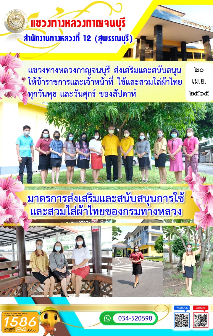 วันที่ 20 เม.ย. 2565 แขวงทางหลวงกาญจนบุรี รณรงค์แต่งกายด้วยผ้าไทย เพื่อส่งเสริมและสนับสนุนการใช้และสวมใส่ผ้าไทย เป็นการอนุรักษ์ และสืบสานภูมิปัญญาของไทย สร้างค่านิยมและการตระหนักรับรู้การรักษามรดก และอัตลักษณ์ภูมิปัญญาของไทย