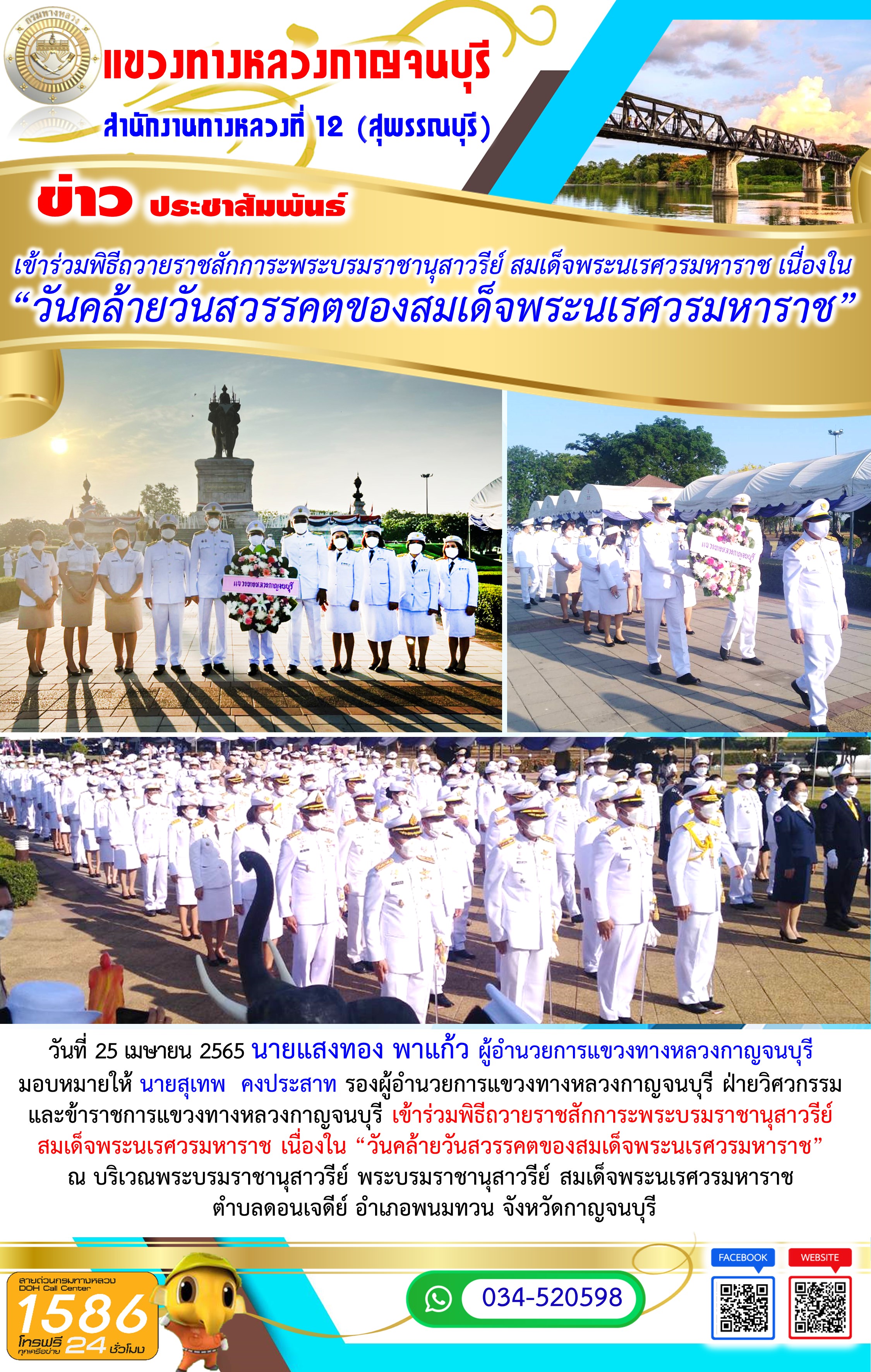 วันที่ 25 เมษายน 2565 นายแสงทอง พาแก้ว ผู้อำนวยการแขวงทางหลวงกาญจนบุรี มอบหมายให้ นายสุเทพ คงประสาท รองผู้อำนวยการแขวงทางหลวงกาญจนบุรี ฝ่ายวิศวกรรม และข้าราชการแขวงทางหลวงกาญจนบุรี เข้าร่วมพิธีถวายราชสักการะพระบรมราชานุสาวรีย์ สมเด็จพระนเรศวรมหาราช เนื่องใน “วันคล้ายวันสวรรคตของสมเด็จพระนเรศวรมหาราช” ณ บริเวณพระบรมราชานุสาวรีย์ พระบรมราชานุสาวรีย์ สมเด็จพระนเรศวรมหาราช ตำบลดอนเจดีย์ อำเภอพนมทวน จังหวัดกาญจนบุรี