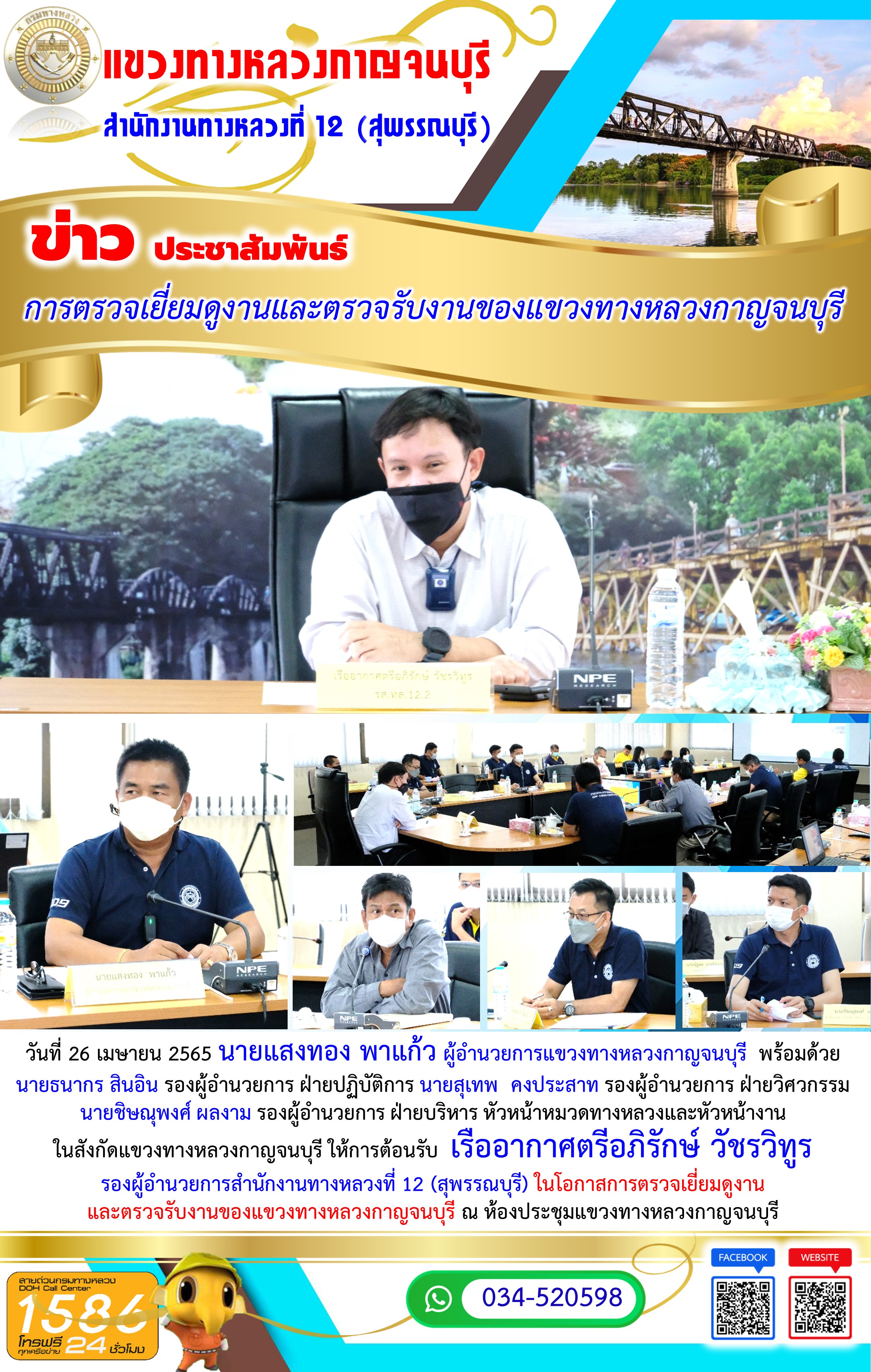 วันที่ 26 เมษายน 2565 นายแสงทอง พาแก้ว ผู้อำนวยการแขวงทางหลวงกาญจนบุรี พร้อมด้วย นายธนากร สินอิน รองผู้อำนวยการ ฝ่ายปฏิบัติการ นายสุเทพ คงประสาท รองผู้อำนวยการ ฝ่ายวิศวกรรม นายชิษณุพงศ์ ผลงาม รองผู้อำนวยการ ฝ่ายบริหาร หัวหน้าหมวดทางหลวงและหัวหน้างาน ในสังกัดแขวงทางหลวงกาญจนบุรี ให้การต้อนรับ เรืออากาศตรีอภิรักษ์ วัชรวิทูร รองผู้อำนวยการสำนักงานทางหลวงที่ 12 (สุพรรณบุรี) ในโอกาสการตรวจเยี่ยมดูงานและตรวจรับงานของแขวงทางหลวงกาญจนบุรี ณ ห้องประชุมแขวงทางหลวงกาญจนบุรี