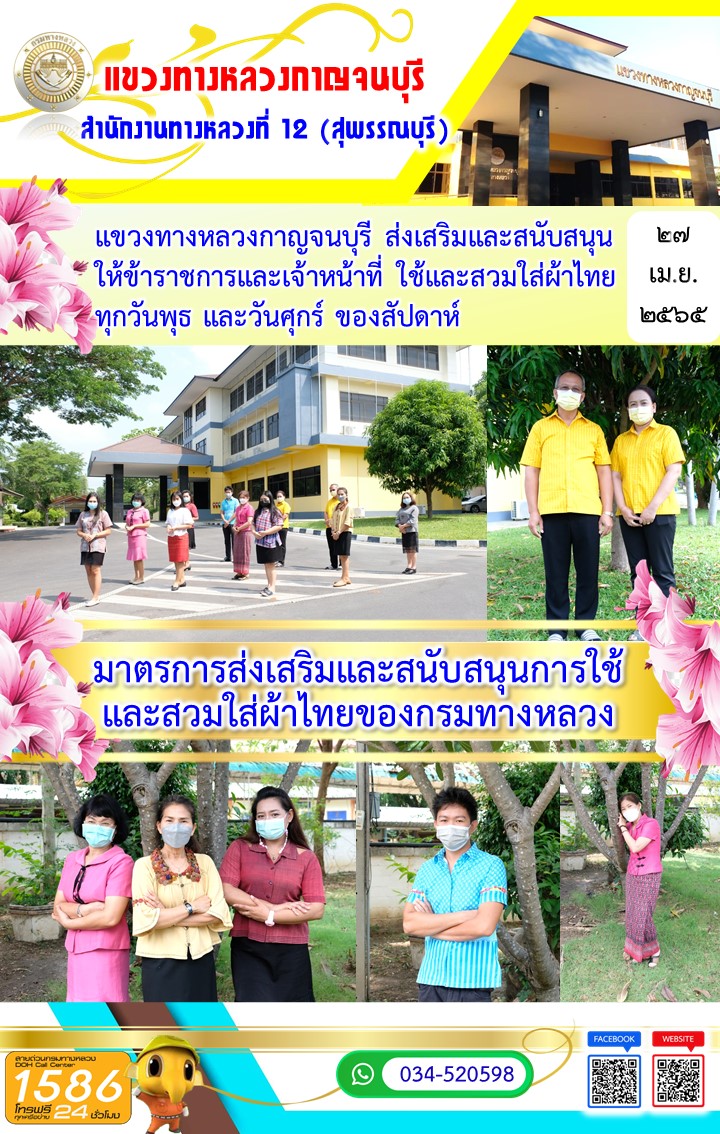 วันที่ 27 เม.ย. 2565 แขวงทางหลวงกาญจนบุรี รณรงค์แต่งกายด้วยผ้าไทย เพื่อส่งเสริมและสนับสนุนการใช้และสวมใส่ผ้าไทย เป็นการอนุรักษ์และสืบสานภูมิปัญญาของไทย สร้างค่านิยมและการตระหนักรับรู้การรักษามรดกและอัตลักษณ์ภูมิปัญญาของไทย