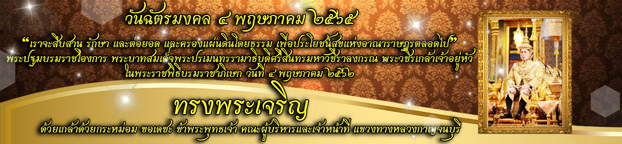 วันฉัตรมงคล ๔ พฤษภาคม ๒๕๖๕ “เราจะสืบสาน รักษา และต่อยอด และครองแผ่นดินโดยธรรม เพื่อประโยชน์สุขแห่งอาณาราษฎรตลอดไป” พระปฐมบรมราชโองการ พระบาทสมเด็จพระปรเมนทรรามาธิบดีศรีสินทรมหาวชิราลงกรณ พระวชิรเกล้าเจ้าอยู่หัว ในพระราชพิธีบรมราชาภิเษก วันที่ ๔ พฤษภาคม ๒๕๖๒ ทรงพระเจริญ ด้วยเกล้าด้วยกระหม่อม ขอเดชะ ข้าพระพุทธเจ้า คณะผู้บริหารและเจ้าหน้าที่ แขวงทางหลวงกาญจนบุรี