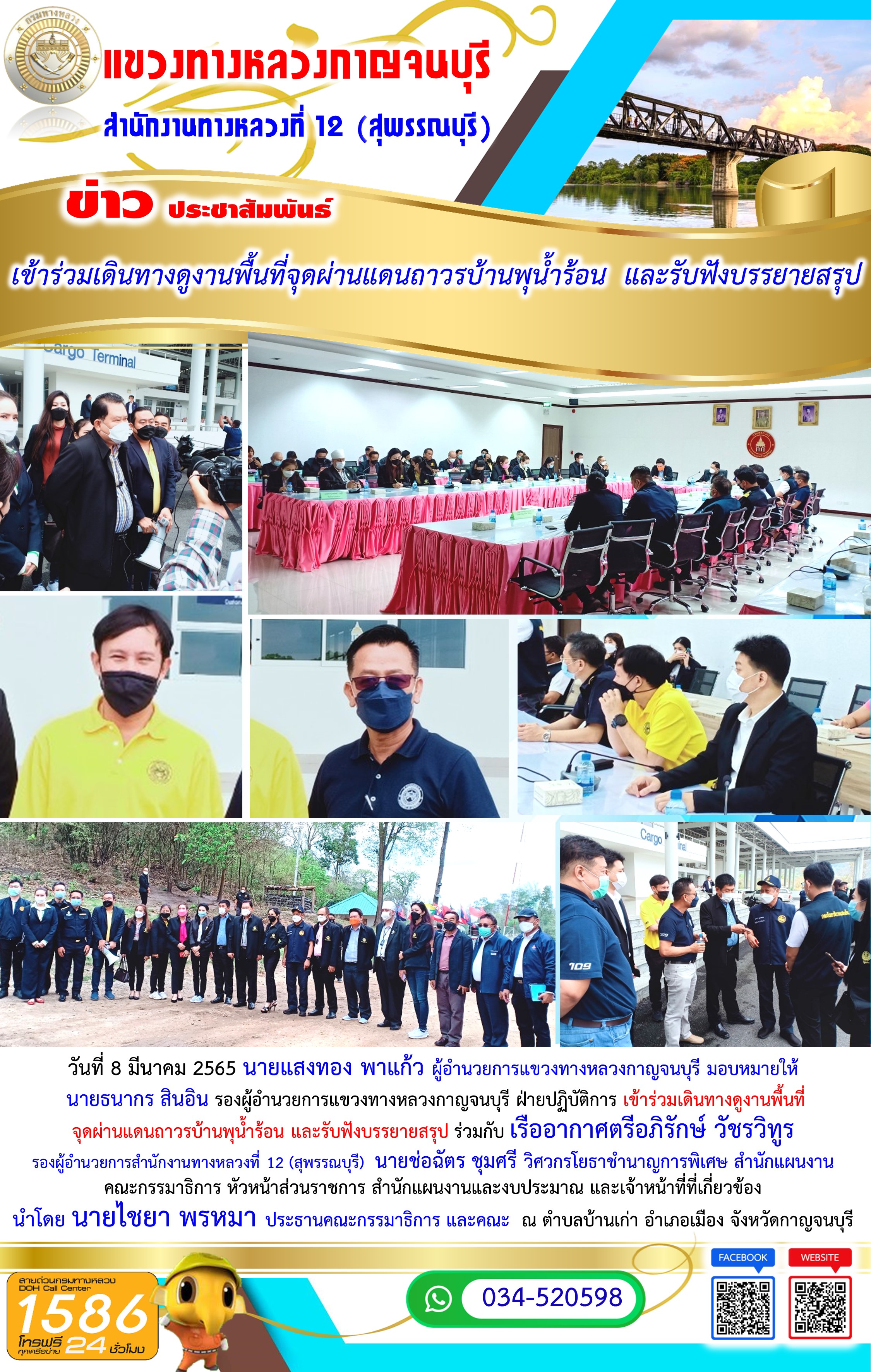 วันที่ 22 กุมภาพันธ์ 2565 นายแสงทอง พาแก้ว ผู้อำนวยการแขวงทางหลวงกาญจนบุรี พร้อมด้วย นายสุเทพ คงประสาท รองผู้อำนวยการแขวงทางหลวงกาญจนบุรี ฝ่ายวิศวกรรม นายธนากร สินอิน รองผู้อำนวยการแขวงทางหลวงกาญจนบุรี ฝ่ายปฏิบัติการ นายอิสระ เอมฉวี หัวหน้างานอำนวยความปลอดภัย และเจ้าหน้าที่แขวงทางหลวงกาญจนบุรี ลงพื้นที่ตรวจรับงาน ติดตั้งไฟฟ้าแสงสว่าง สัญญาที่ กจ.(ส) 2/2565 ในทางหลวงหมายเลข 3272 ตอน ทองผาภูมิ – ปิล๊อก ระหว่าง กม.3+200 – กม.34+400 (เป็นตอนๆ)