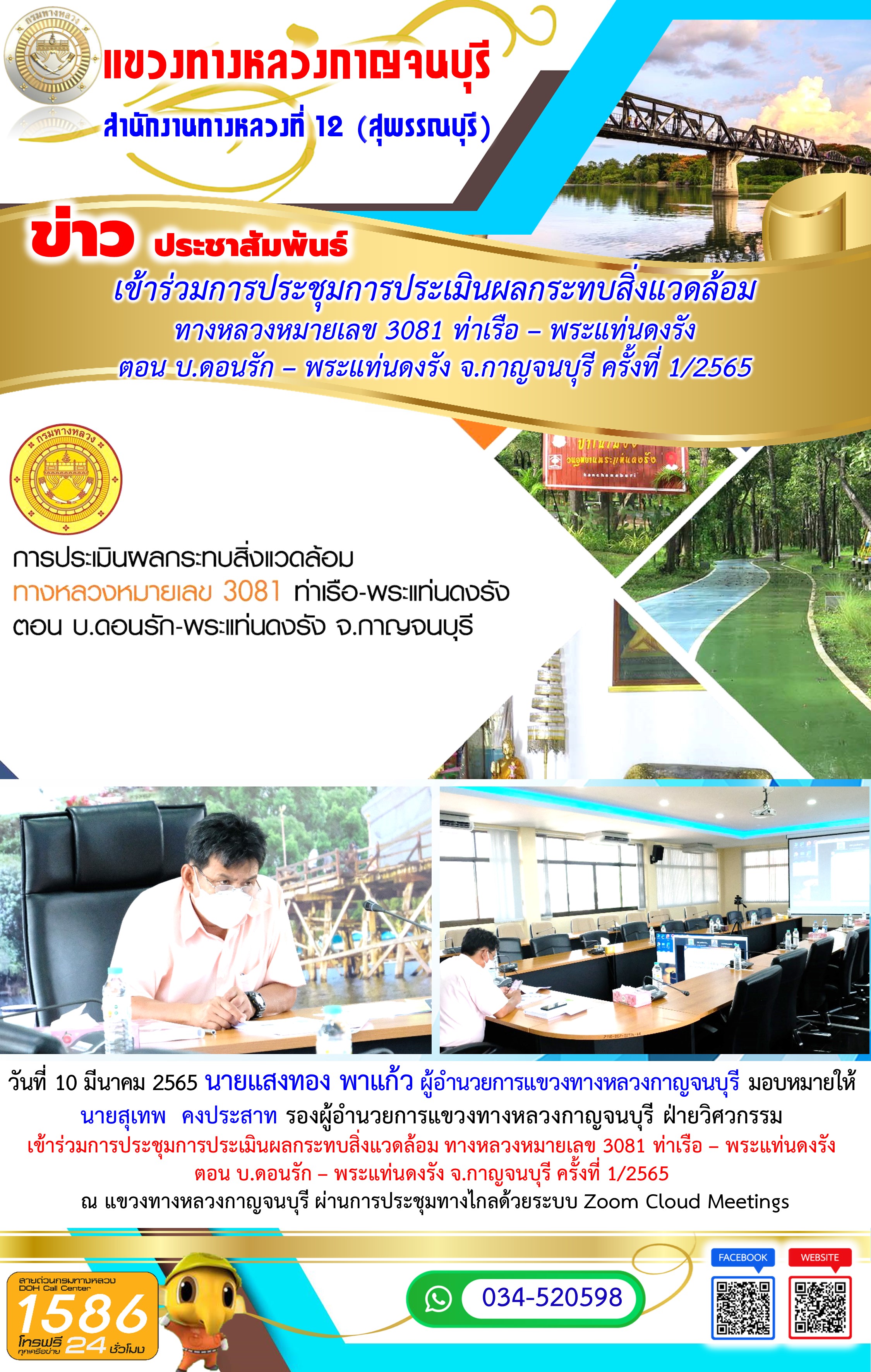 เข้าร่วมการประชุมการประเมินผลกระทบสิ่งแวดล้อม ทางหลวงหมายเลข 3081 ท่าเรือ – พระแท่นดงรัง ตอน บ.ดอนรัก – พระแท่นดงรัง จ.กาญจนบุรี ครั้งที่ 1/2565 ณ แขวงทางหลวงกาญจนบุรี
