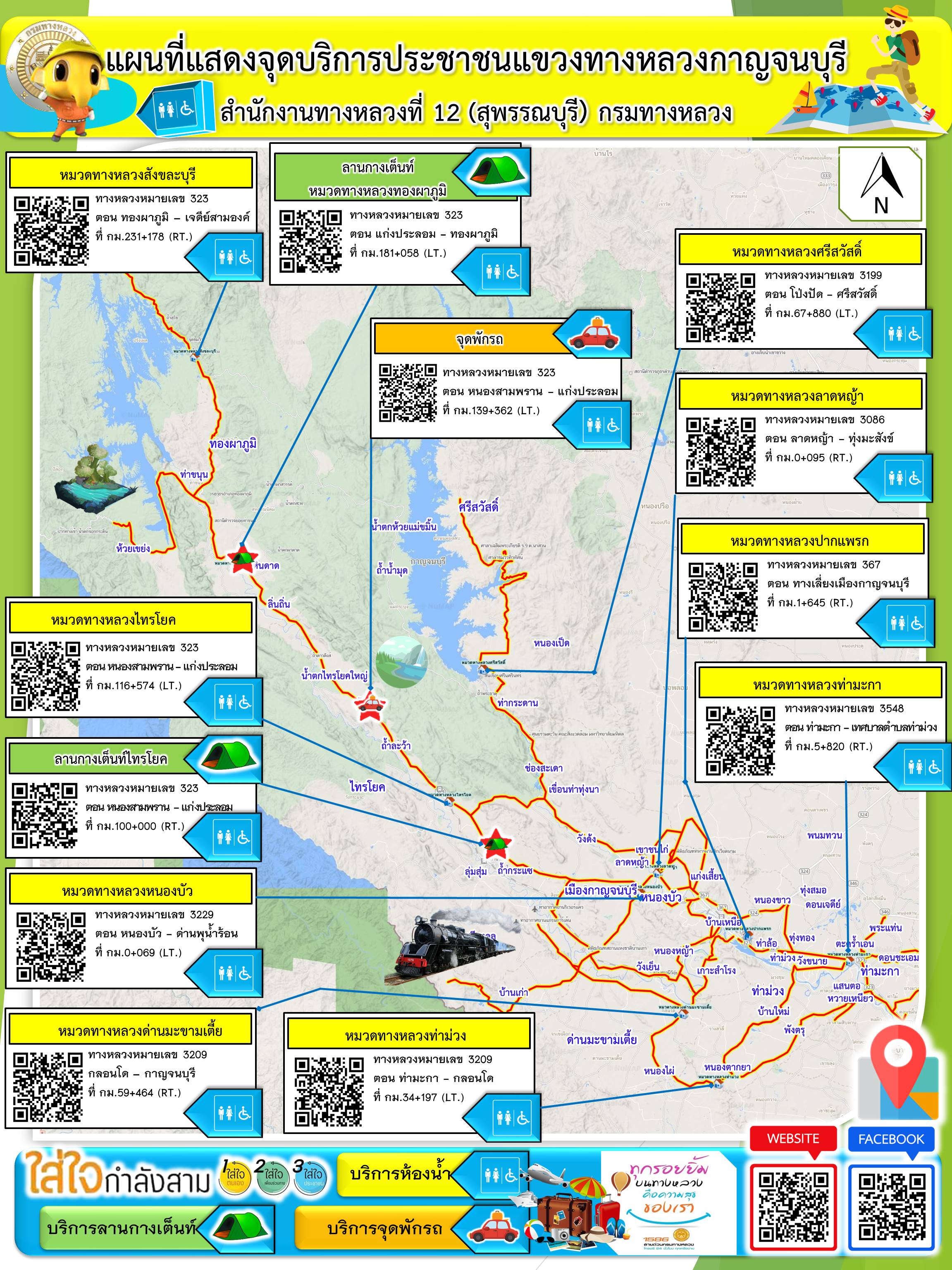 แผนที่แสดงจุดบริการประชาชนแขวงทางหลวงกาญจนบุรี สำนักงานทางหลวงที่ 12 (สุพรรณบุรี) กรมทางหลวง จุดบริการลานกางเต็นท์ จุดพักรถ ห้องน้ำ และสอบถามข้อมูลต่างๆ สำหรับนักท่องเที่ยวแวะพักใช้บริการ โดยมีเจ้าหน้าที่พร้อมบริการตลอด 24 ชั่วโมง ในช่วงเทศกาลต้อนรับปีใหม่ 2565 ภาพขยาย