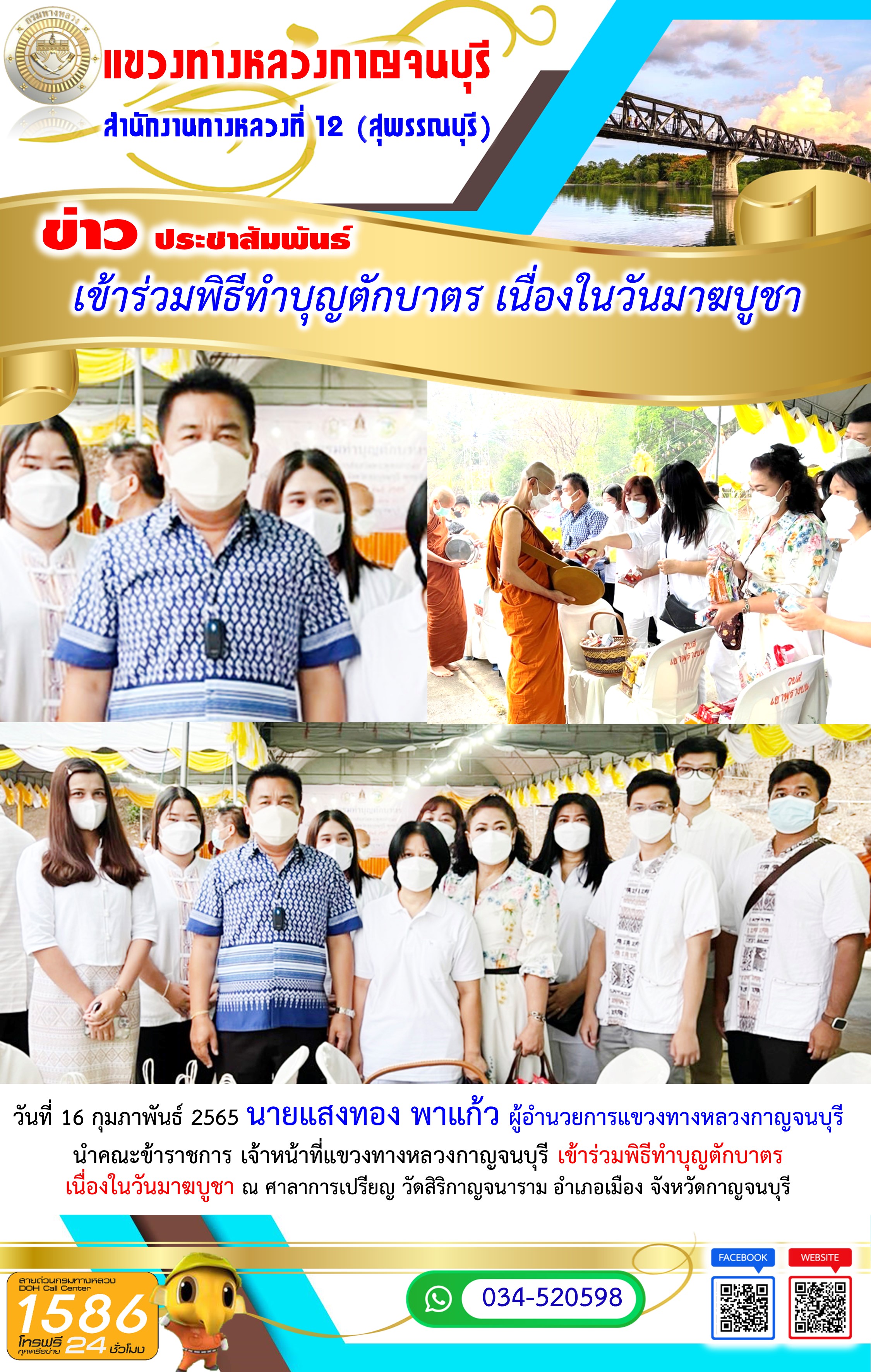 วันที่ 16 กุมภาพันธ์ 2565 นายแสงทอง พาแก้ว ผู้อำนวยการแขวงทางหลวงกาญจนบุรี นำคณะข้าราชการ เจ้าหน้าที่แขวงทางหลวงกาญจนบุรี เข้าร่วมพิธีทำบุญตักบาตร เนื่องในวันมาฆบูชา ณ ศาลาการเปรียญ วัดสิริกาญจนาราม อำเภอเมือง จังหวัดกาญจนบุรี #กรมทางหลวง #สายด่วนกรมทางหลวง1586 #แขวงทางหลวงกาญจนบุรี โทร 034-520-598