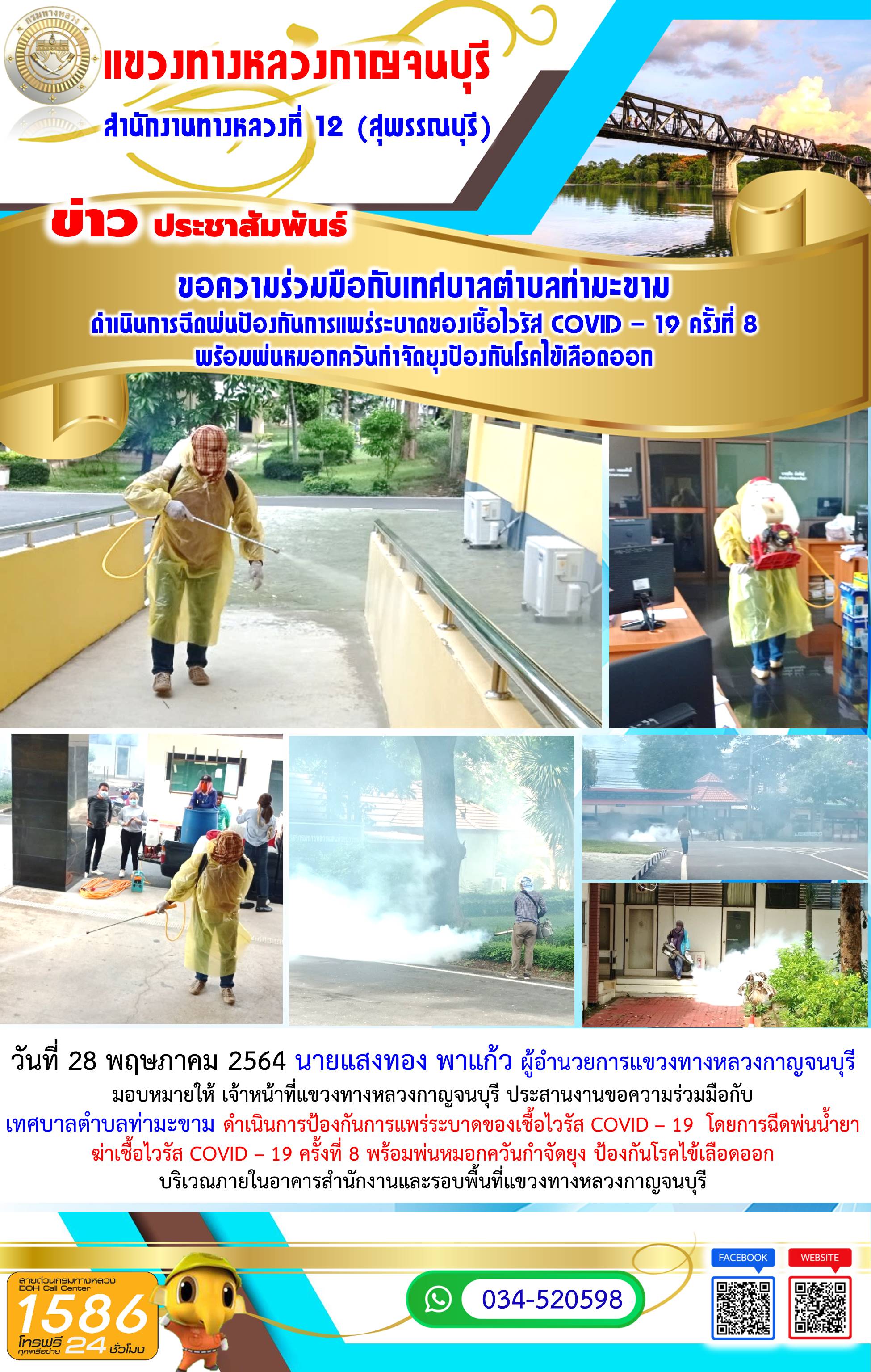 วันที่ 28 พฤษภาคม 2564 นายแสงทอง พาแก้ว ผู้อำนวยการแขวงทางหลวงกาญจนบุรี มอบหมายให้ เจ้าหน้าที่แขวงทางหลวงกาญจนบุรี ประสานงานขอความร่วมมือกับ เทศบาลตำบลท่ามะขาม ดำเนินการป้องกันการแพร่ระบาดของเชื้อไวรัส COVID – 19 โดยการฉีดพ่นน้ำยาฆ่าเชื้อไวรัส COVID – 19 ครั้งที่ 8 พร้อมพ่นหมอกควันกำจัดยุง ป้องกันโรคไข้เลือดออก บริเวณภายในอาคารสำนักงานและรอบพื้นที่แขวงทางหลวงกาญจนบุรี