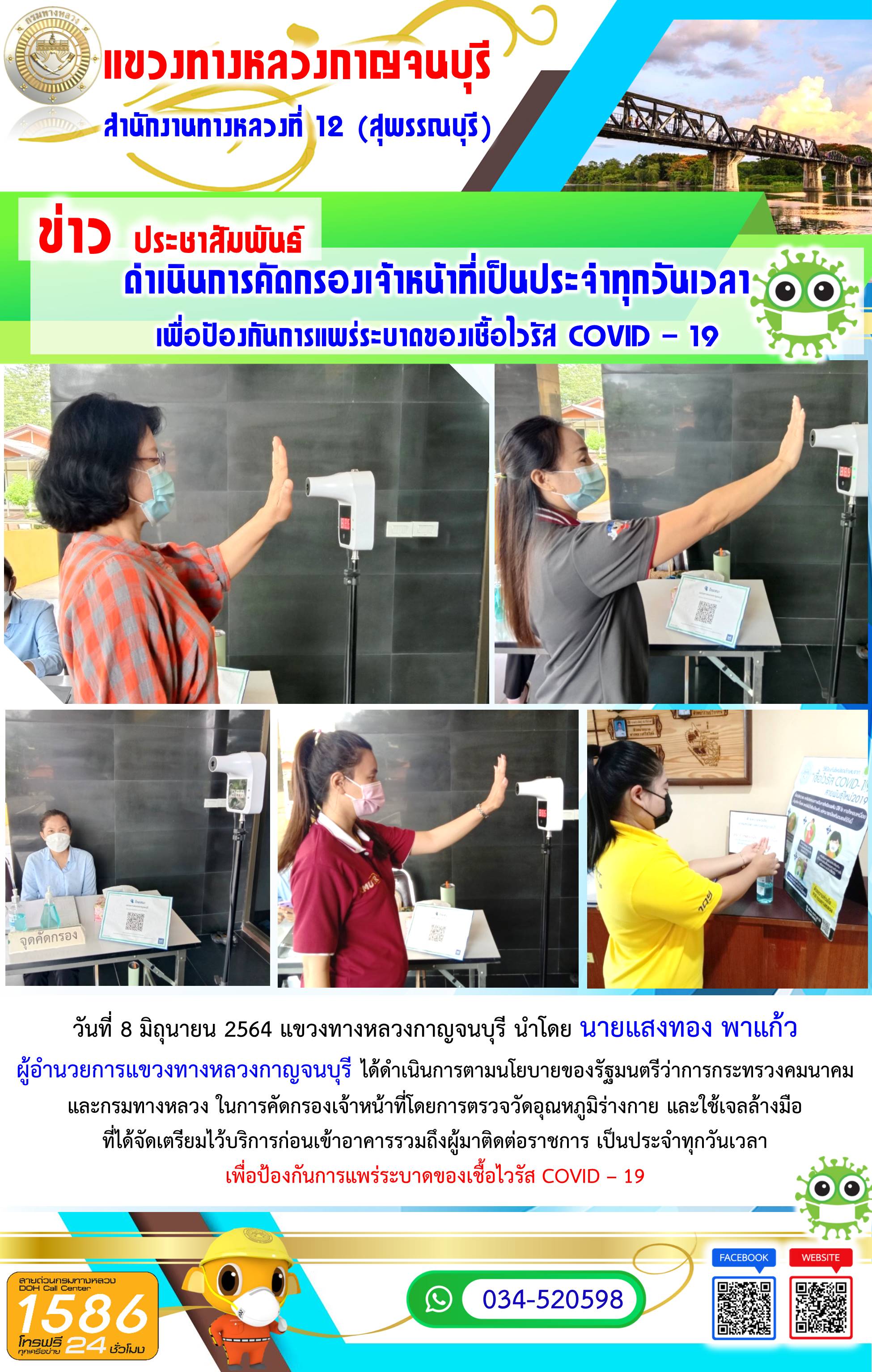 วันที่ 23 มิถุนายน 2564 นายแสงทอง พาแก้ว ผู้อำนวยการแขวงทางหลวงกาญจนบุรี พร้อมด้วย นายสุเทพ คงประสาท รองผู้อำนวยการแขวงทางหลวงกาญจนบุรี ฝ่ายวิศวกรรม เข้าร่วมประชุมตรวจรับงานจ้างเหมา ทำการยกระดับมาตรฐานและเพิ่มประสิทธิภาพทางหลวง ทางหลวงหมายเลข 3398 ตอน ท่าพะเนียด - ทุ่งมะสังข์ ระหว่าง กม.7+200 – กม.11+600 ณ ห้องประชุมแขวงทางหลวงกาญจนบุรี โดยมี นายนพพร พิสุทธิมาน รองผู้อำนวยการสำนักงานทางหลวงที่ 12 (สุพรรณบุรี) เป็นประธานในการประชุมฯ