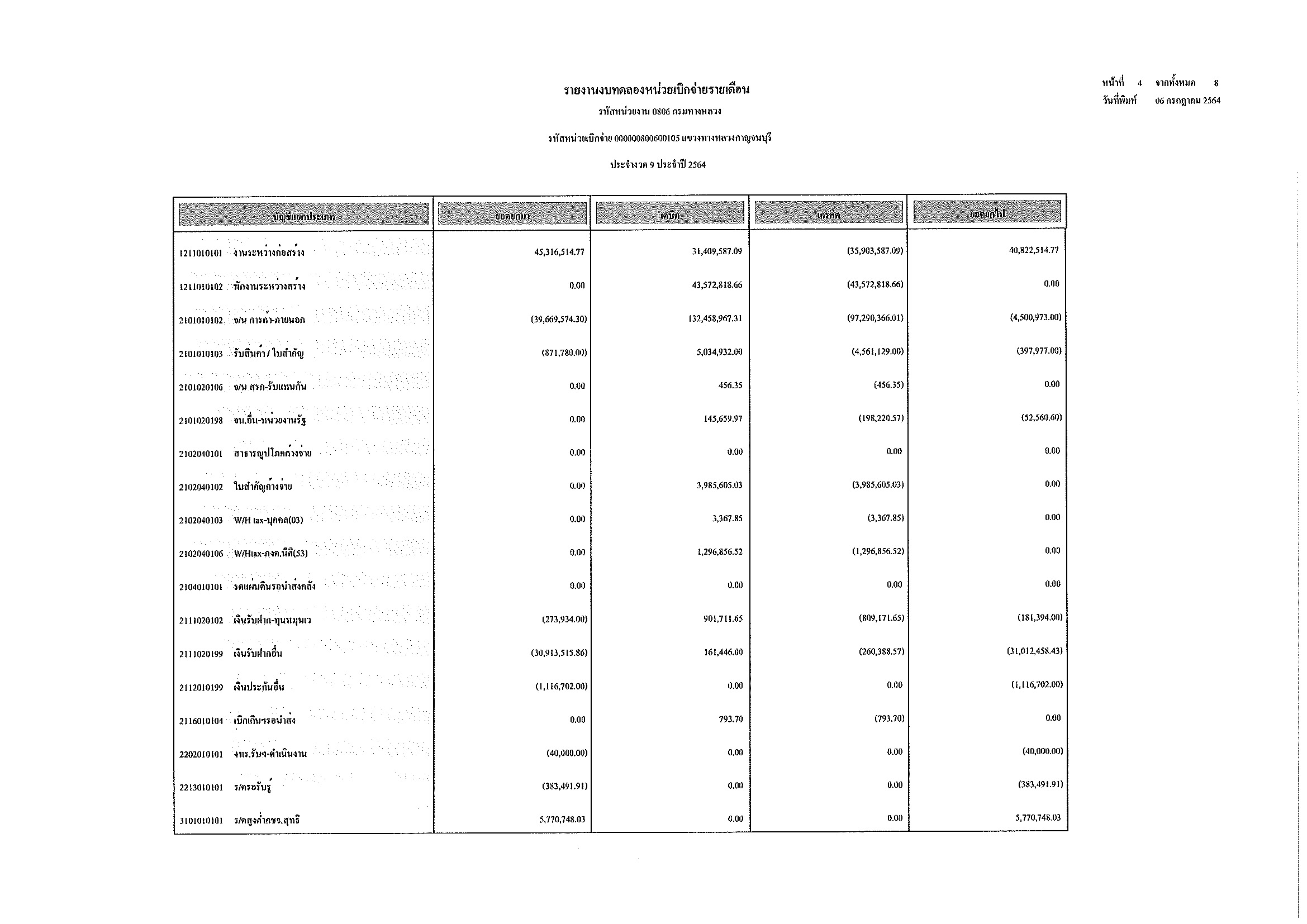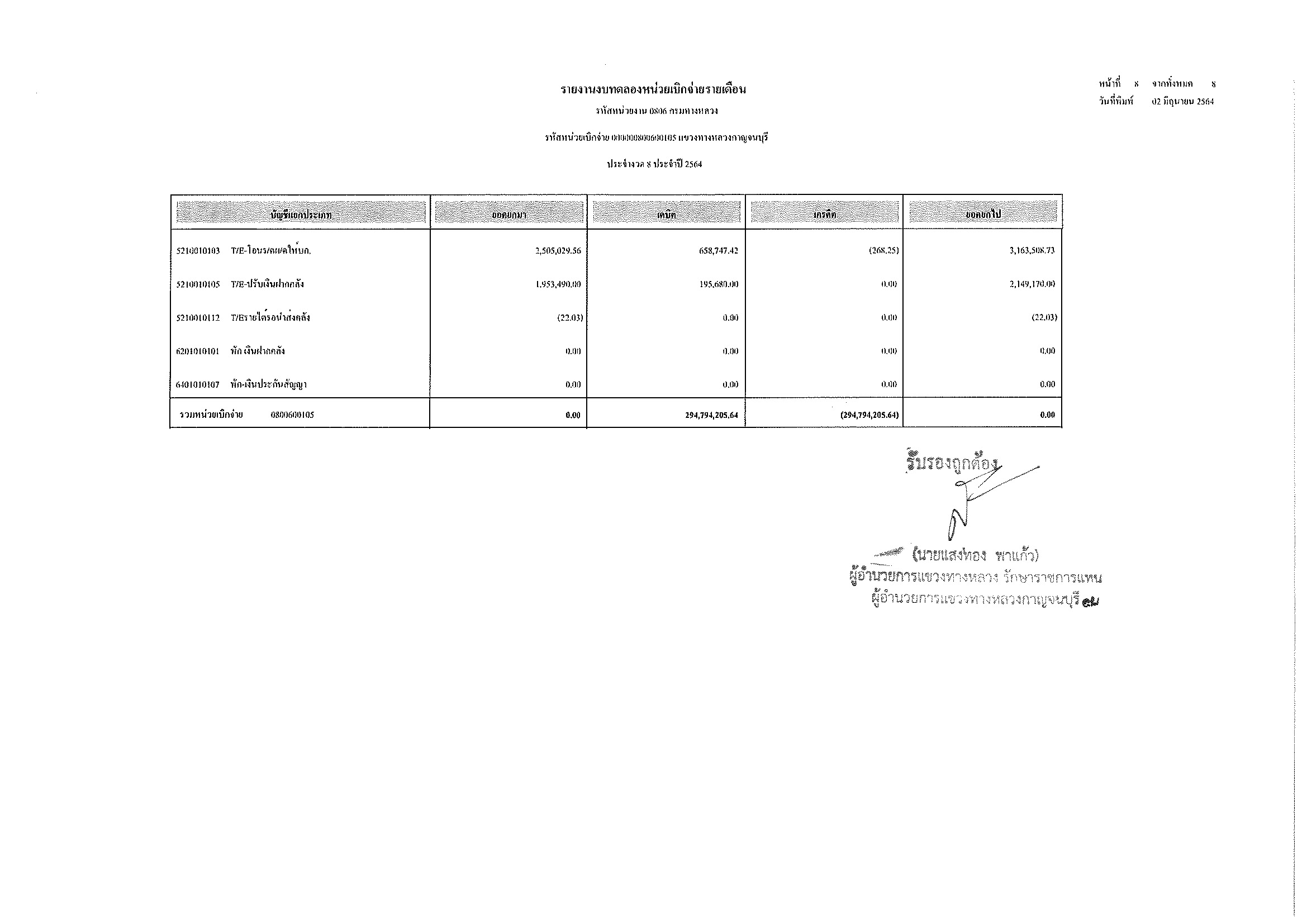 รายงานงบทดลองหน่วยเบิกจ่ายรายเดือน ประจำงวด 8 ประจำปีที่ 2564