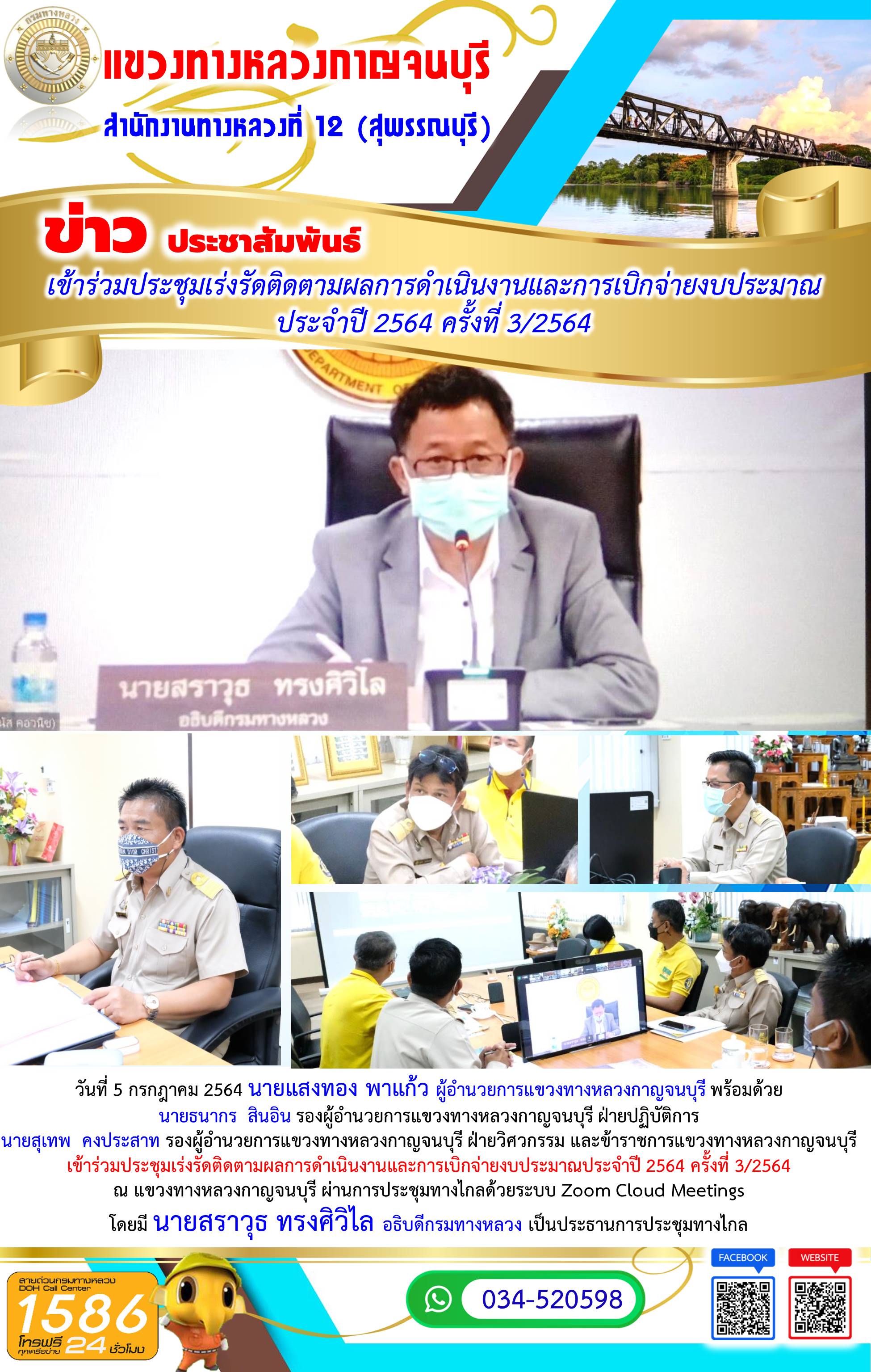 วันที่ 28 พฤษภาคม 2564 นายแสงทอง พาแก้ว ผู้อำนวยการแขวงทางหลวงกาญจนบุรี พร้อมด้วย นายสุเทพ คงประสาท รองผู้อำนวยการแขวงทางหลวงกาญจนบุรี ฝ่ายวิศวกรรม และ นายอิสระ เอมฉวี หัวหน้างานวางแผน เข้าร่วมประชุมสรุปประเด็นปัญหาในพื้นที่เขต/แขวง ทั่วประเทศ ณ แขวงทางหลวงกาญจนบุรี ผ่านการประชุมทางไกลด้วยระบบ Zoom Cloud Meetings โดยมี นายสราวุธ ทรงศิวิไล อธิบดีกรมทางหลวง เป็นประธานการประชุมทางไกล