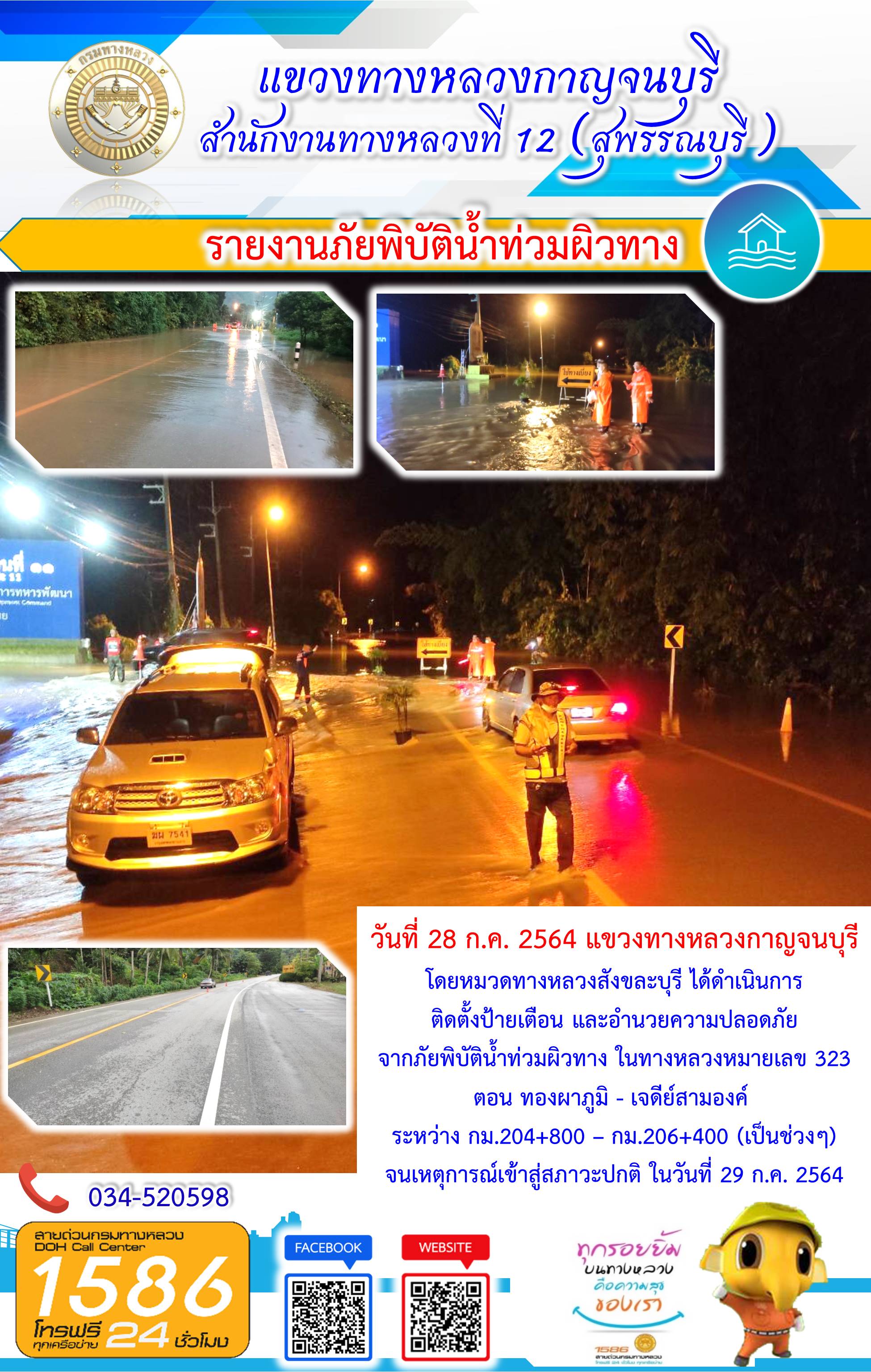 วันที่ 28 ก.ค. 2564 แขวงทางหลวงกาญจนบุรี โดยหมวดทางหลวงสังขละบุรี ได้ดำเนินการติดตั้งป้ายเตือน และอำนวยความปลอดภัยจากภัยพิบัติน้ำท่วมผิวทาง ในทางหลวงหมายเลข 323 ตอน ทองผาภูมิ - เจดีย์สามองค์ ? ระหว่าง กม.204+800 – กม.206+400 (เป็นช่วงๆ) จนเหตุการณ์เข้าสู่สภาวะปกติ ในวันที่ 29 ก.ค. 2564 #กรมทางหลวง #สายด่วนกรมทางหลวง1586