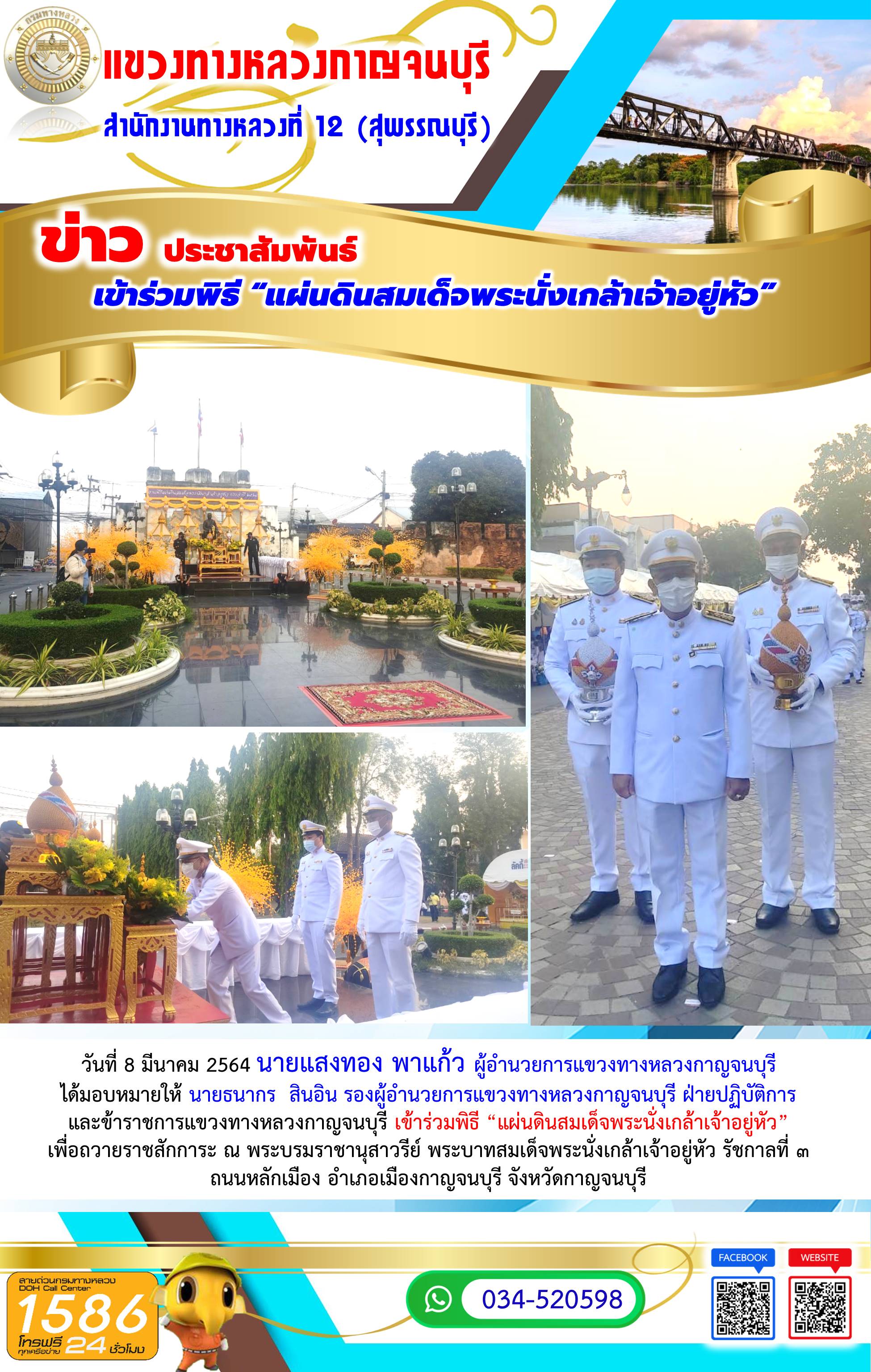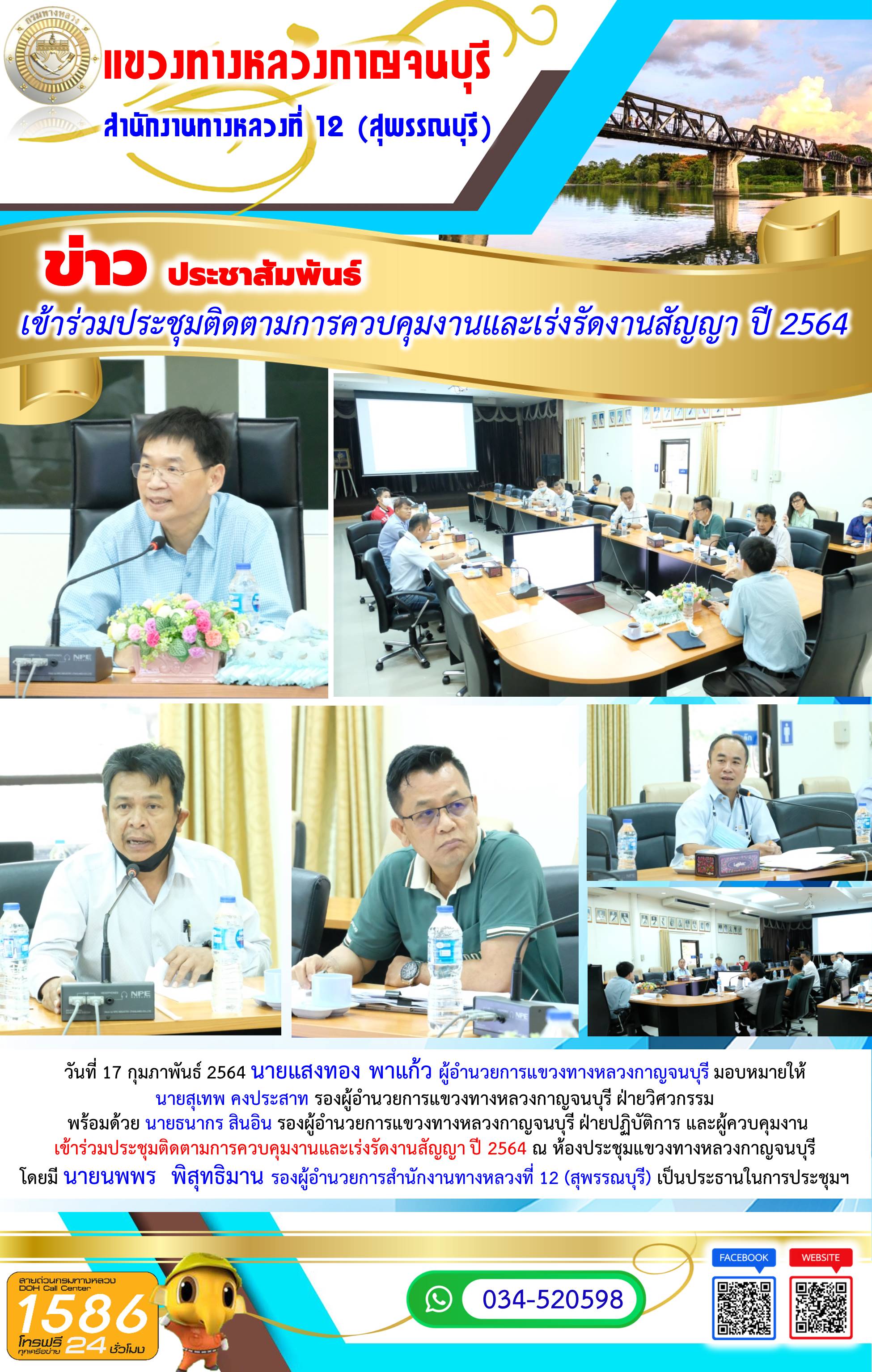 วันที่ 17 กุมภาพันธ์ 2564 นายแสงทอง พาแก้ว ผู้อำนวยการแขวงทางหลวงกาญจนบุรี มอบหมายให้ นายสุเทพ คงประสาท รองผู้อำนวยการแขวงทางหลวงกาญจนบุรี ฝ่ายวิศวกรรม พร้อมด้วย นายธนากร สินอิน รองผู้อำนวยการแขวงทางหลวงกาญจนบุรี ฝ่ายปฏิบัติการ และผู้ควบคุมงาน เข้าร่วมประชุมติดตามการควบคุมงานและเร่งรัดงานสัญญา ปี 2564 ณ ห้องประชุมแขวงทางหลวงกาญจนบุรี โดยมี นายนพพร พิสุทธิมาน รองผู้อำนวยการสำนักงานทางหลวงที่ 12 (สุพรรณบุรี) เป็นประธานในการประชุมฯ