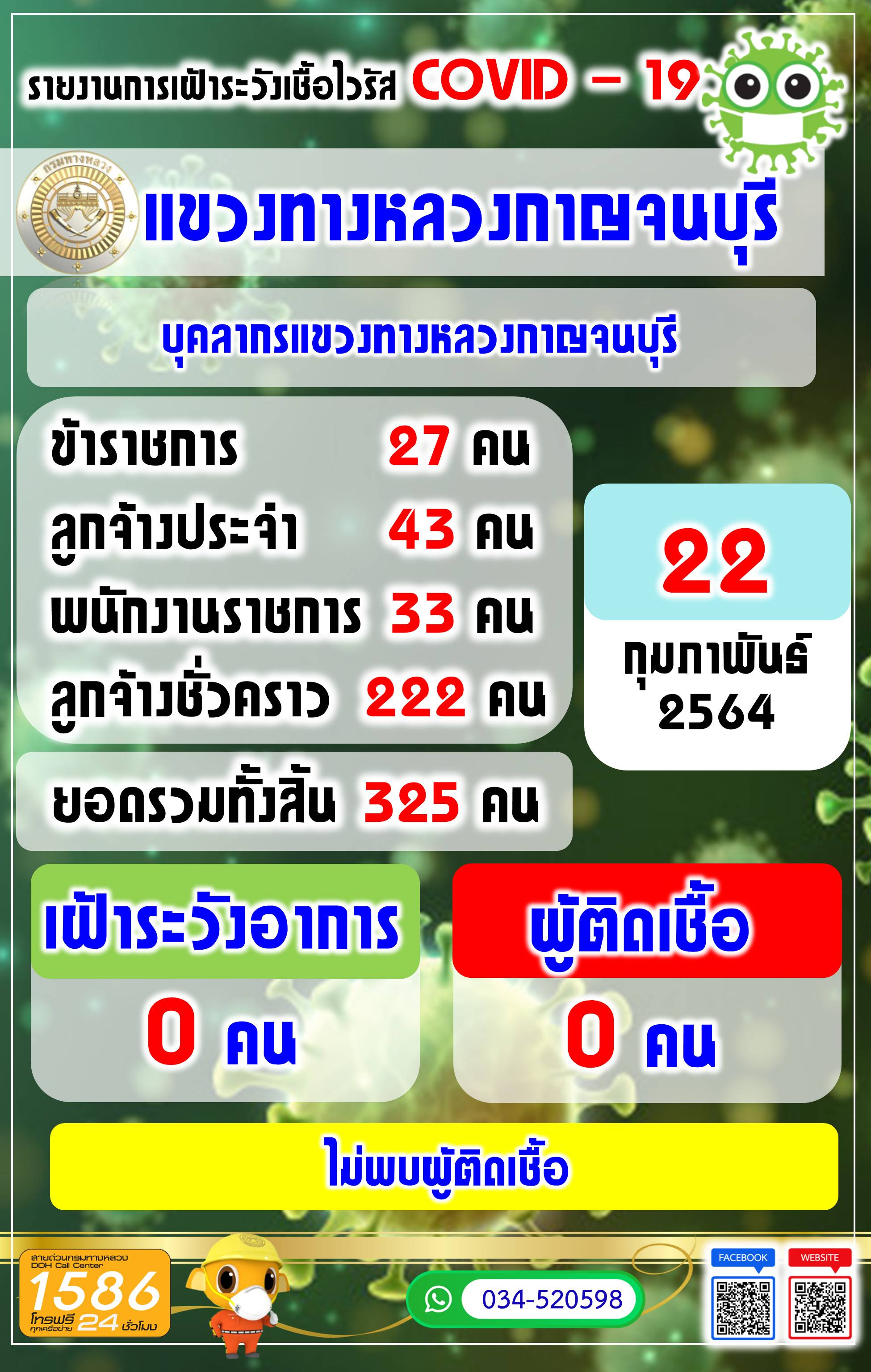 วันที่ 22 กุมภาพันธ์ 2564 แขวงทางหลวงกาญจนบุรี นำโดย นายแสงทอง พาแก้ว ผู้อำนวยการแขวงทางหลวงกาญจนบุรี ได้ดำเนินการตามนโยบายของรัฐมนตรีว่าการกระทรวงคมนาคมและกรมทางหลวง ในการคัดกรองเจ้าหน้าที่โดยการตรวจวัดอุณหภูมิร่างกาย และใช้เจลล้างมือที่ได้จัดเตรียมไว้บริการก่อนเข้าอาคารรวมถึงผู้มาติดต่อราชการ เพื่อป้องกันการแพร่ระบาดของเชื้อไวรัส COVID – 19