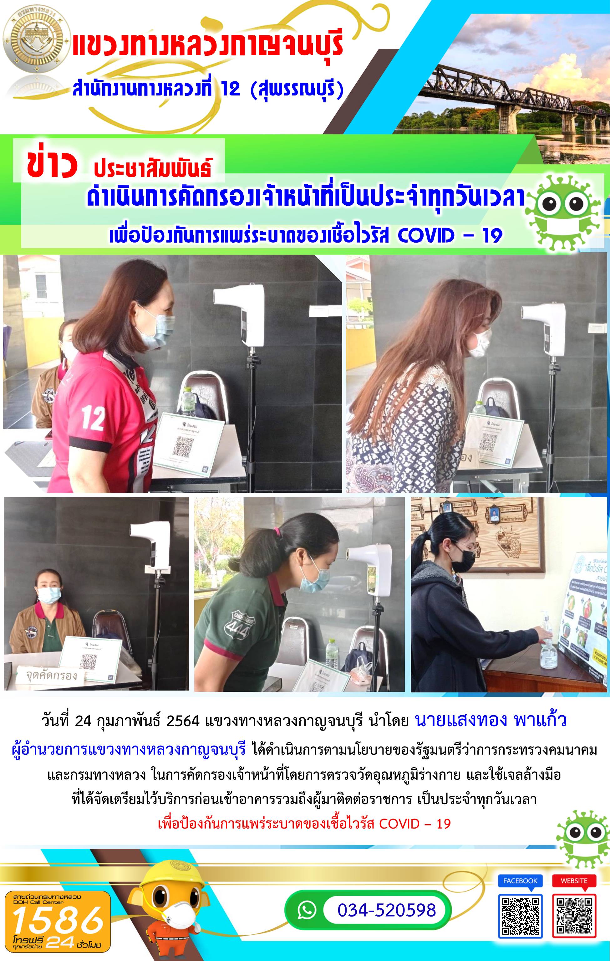 วันที่ 24 กุมภาพันธ์ 2564 แขวงทางหลวงกาญจนบุรี นำโดย นายแสงทอง พาแก้ว ผู้อำนวยการแขวงทางหลวงกาญจนบุรี ได้ดำเนินการตามนโยบายของรัฐมนตรีว่าการกระทรวงคมนาคมและกรมทางหลวง ในการคัดกรองเจ้าหน้าที่โดยการตรวจวัดอุณหภูมิร่างกาย และใช้เจลล้างมือที่ได้จัดเตรียมไว้บริการก่อนเข้าอาคารรวมถึงผู้มาติดต่อราชการ เพื่อป้องกันการแพร่ระบาดของเชื้อไวรัส COVID – 19