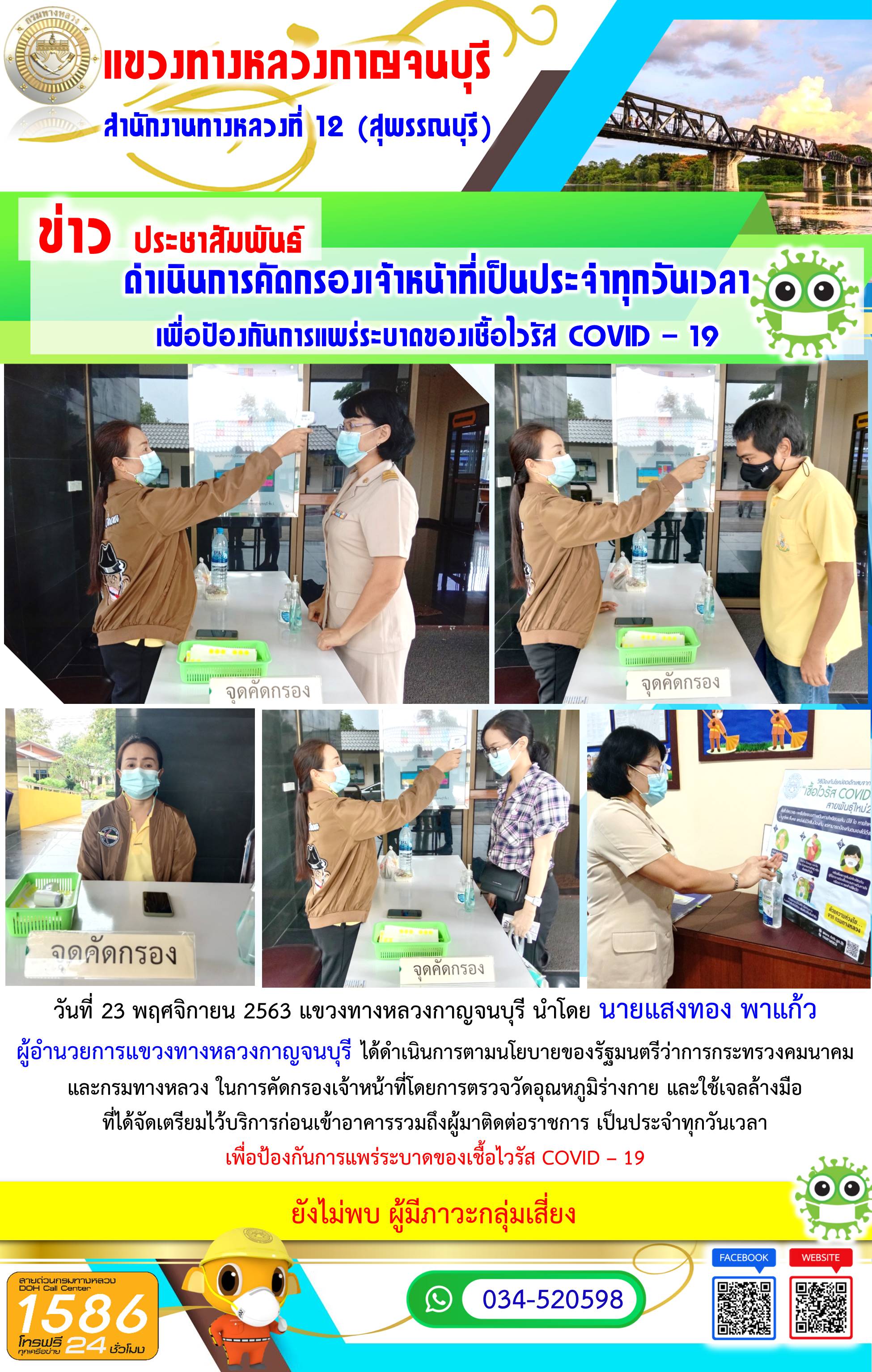 วันที่ 23 พฤศจิกายน 2563 แขวงทางหลวงกาญจนบุรี นำโดย นายแสงทอง พาแก้ว ผู้อำนวยการแขวงทางหลวงกาญจนบุรี ได้ดำเนินการตามนโยบายของรัฐมนตรีว่าการกระทรวงคมนาคมและกรมทางหลวง ในการคัดกรองเจ้าหน้าที่โดยการตรวจวัดอุณหภูมิร่างกาย และใช้เจลล้างมือที่ได้จัดเตรียมไว้บริการก่อนเข้าอาคารรวมถึงผู้มาติดต่อราชการ เพื่อป้องกันการแพร่ระบาดของเชื้อไวรัส COVID – 19