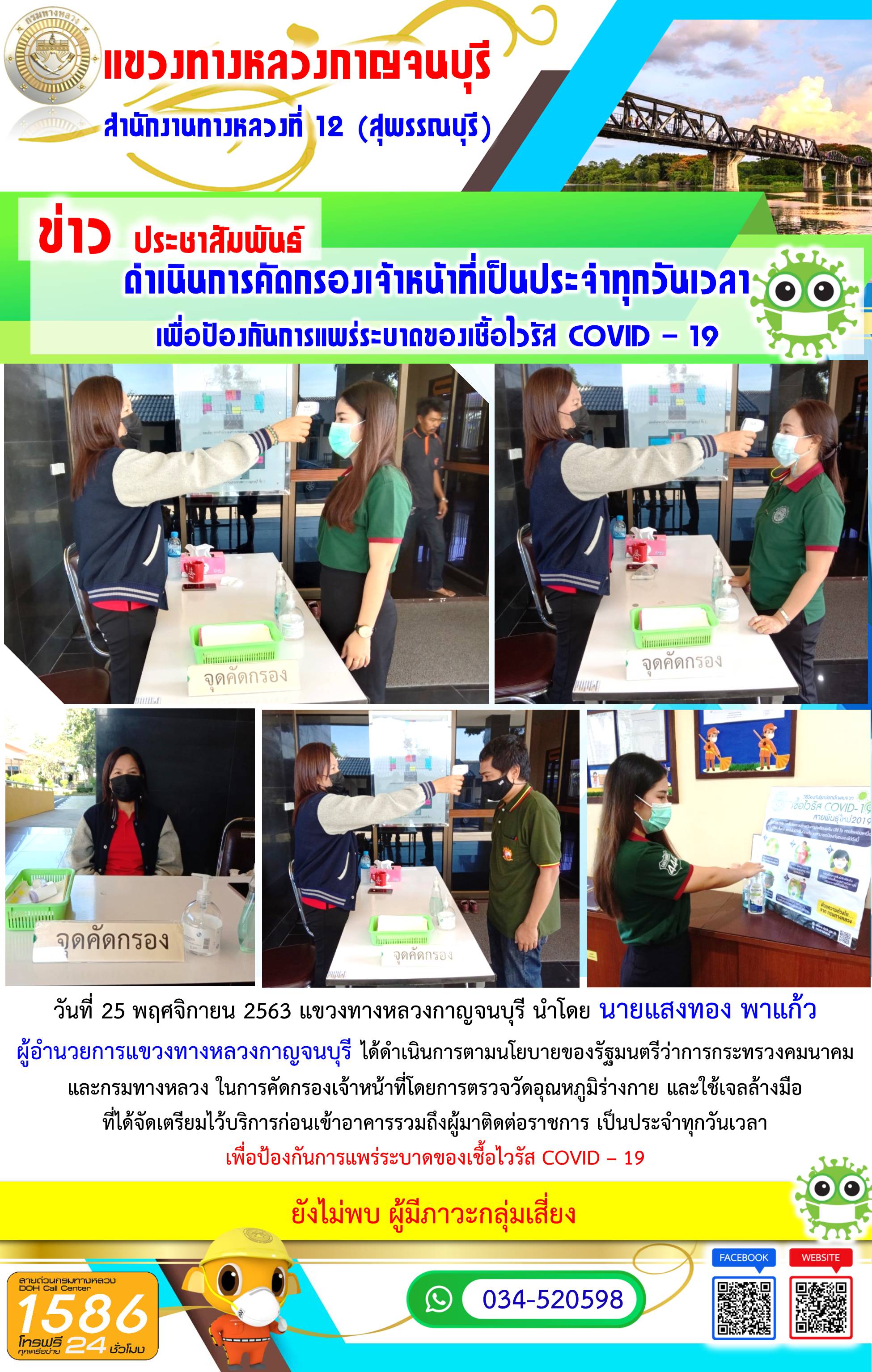 วันที่ 25 พฤศจิกายน 2563 แขวงทางหลวงกาญจนบุรี นำโดย นายแสงทอง พาแก้ว ผู้อำนวยการแขวงทางหลวงกาญจนบุรี ได้ดำเนินการตามนโยบายของรัฐมนตรีว่าการกระทรวงคมนาคมและกรมทางหลวง ในการคัดกรองเจ้าหน้าที่โดยการตรวจวัดอุณหภูมิร่างกาย และใช้เจลล้างมือที่ได้จัดเตรียมไว้บริการก่อนเข้าอาคารรวมถึงผู้มาติดต่อราชการ เพื่อป้องกันการแพร่ระบาดของเชื้อไวรัส COVID – 19