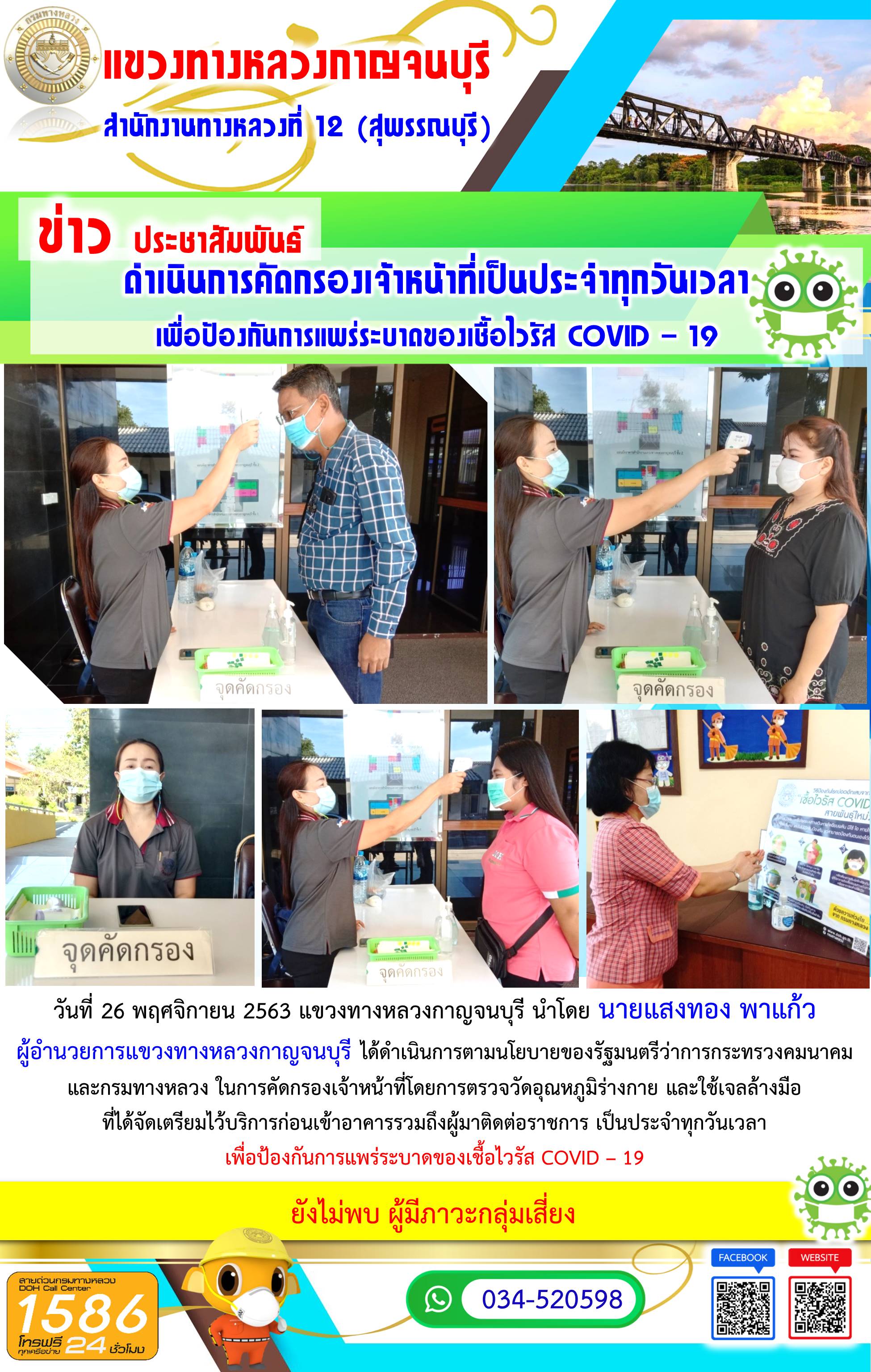 วันที่ 26 พฤศจิกายน 2563 แขวงทางหลวงกาญจนบุรี นำโดย นายแสงทอง พาแก้ว ผู้อำนวยการแขวงทางหลวงกาญจนบุรี ได้ดำเนินการตามนโยบายของรัฐมนตรีว่าการกระทรวงคมนาคมและกรมทางหลวง ในการคัดกรองเจ้าหน้าที่โดยการตรวจวัดอุณหภูมิร่างกาย และใช้เจลล้างมือที่ได้จัดเตรียมไว้บริการก่อนเข้าอาคารรวมถึงผู้มาติดต่อราชการ เพื่อป้องกันการแพร่ระบาดของเชื้อไวรัส COVID – 19