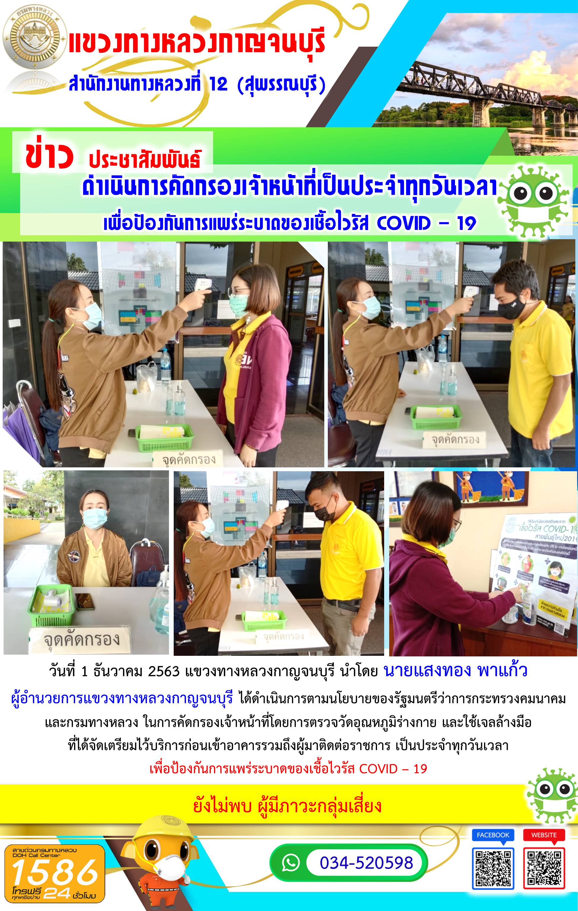 วันที่ 1 ธันวาคม 2563 แขวงทางหลวงกาญจนบุรี นำโดย นายแสงทอง พาแก้ว ผู้อำนวยการแขวงทางหลวงกาญจนบุรี ได้ดำเนินการตามนโยบายของรัฐมนตรีว่าการกระทรวงคมนาคมและกรมทางหลวง ในการคัดกรองเจ้าหน้าที่โดยการตรวจวัดอุณหภูมิร่างกาย และใช้เจลล้างมือที่ได้จัดเตรียมไว้บริการก่อนเข้าอาคารรวมถึงผู้มาติดต่อราชการ เพื่อป้องกันการแพร่ระบาดของเชื้อไวรัส COVID – 19