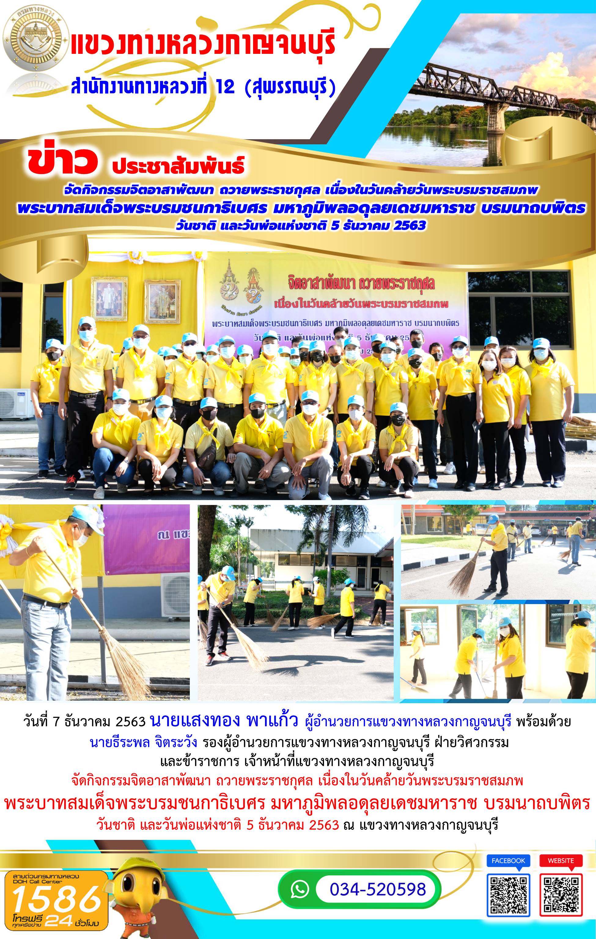 วันที่ 7 ธันวาคม 2563 นายแสงทอง พาแก้ว ผู้อำนวยการแขวงทางหลวงกาญจนบุรี พร้อมด้วย นายธีระพล จิตระวัง รองผู้อำนวยการแขวงทางหลวงกาญจนบุรี ฝ่ายวิศวกรรม และข้าราชการ เจ้าหน้าที่แขวงทางหลวงกาญจนบุรี จัดกิจกรรมจิตอาสาพัฒนา ถวายพระราชกุศล เนื่องในวันคล้ายวันพระบรมราชสมภพ พระบาทสมเด็จพระบรมชนกาธิเบศร มหาภูมิพลอดุลยเดชมหาราช บรมนาถบพิตร วันชาติ และวันพ่อแห่งชาติ 5 ธันวาคม 2563 ณ แขวงทางหลวงกาญจนบุรี