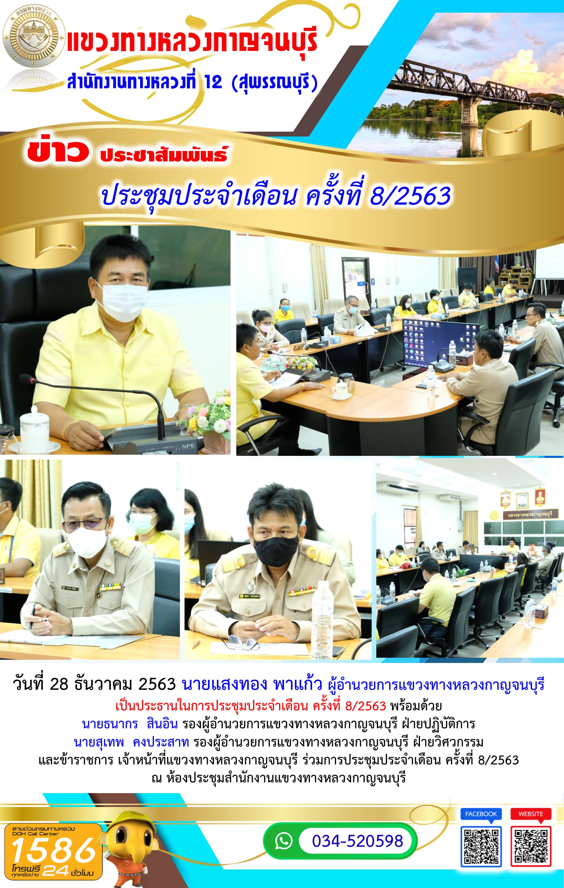 วันที่ 28 ธันวาคม 2563 นายแสงทอง พาแก้ว ผู้อำนวยการแขวงทางหลวงกาญจนบุรี เป็นประธานในการประชุมประจำเดือน ครั้งที่ 8/2563 พร้อมด้วย นายธนากร สินอิน รองผู้อำนวยการแขวงทางหลวงกาญจนบุรี ฝ่ายปฏิบัติการ นายสุเทพ คงประสาท รองผู้อำนวยการแขวงทางหลวงกาญจนบุรี ฝ่ายวิศวกรรม และข้าราชการ เจ้าหน้าที่แขวงทางหลวงกาญจนบุรี ร่วมการประชุมประจำเดือน ครั้งที่ 8/2563 ณ ห้องประชุมสำนักงานแขวงทางหลวงกาญจนบุรี