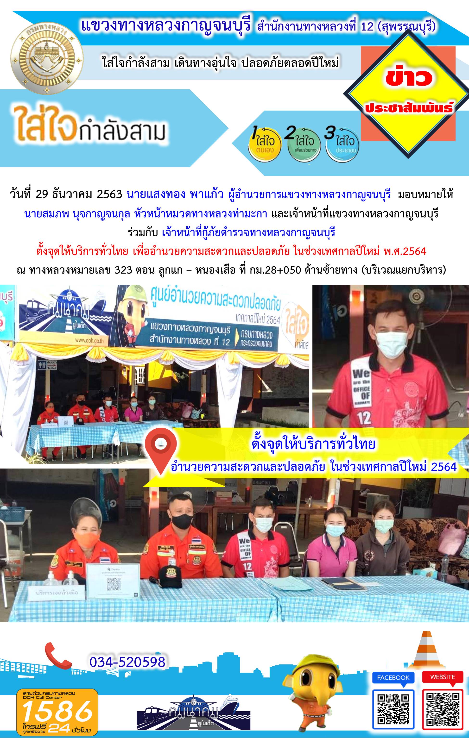 วันที่ 29 ธันวาคม 2563 นายแสงทอง พาแก้ว ผู้อำนวยการแขวงทางหลวงกาญจนบุรี มอบหมายให้ นายสมภพ นุจกาญจนกุล หัวหน้าหมวดทางหลวงท่ามะกา และเจ้าหน้าที่แขวงทางหลวงกาญจนบุรี ร่วมกับ เจ้าหน้าที่กู้ภัยตำรวจทางหลวงกาญจนบุรี ตั้งจุดให้บริการทั่วไทย เพื่ออำนวยความสะดวกและปลอดภัย ในช่วงเทศกาลปีใหม่ พ.ศ.2564 ณ ทางหลวงหมายเลข 323 ตอน ลูกแก – หนองเสือ ที่ กม.28+050 ด้านซ้ายทาง (บริเวณแยกบริหาร)